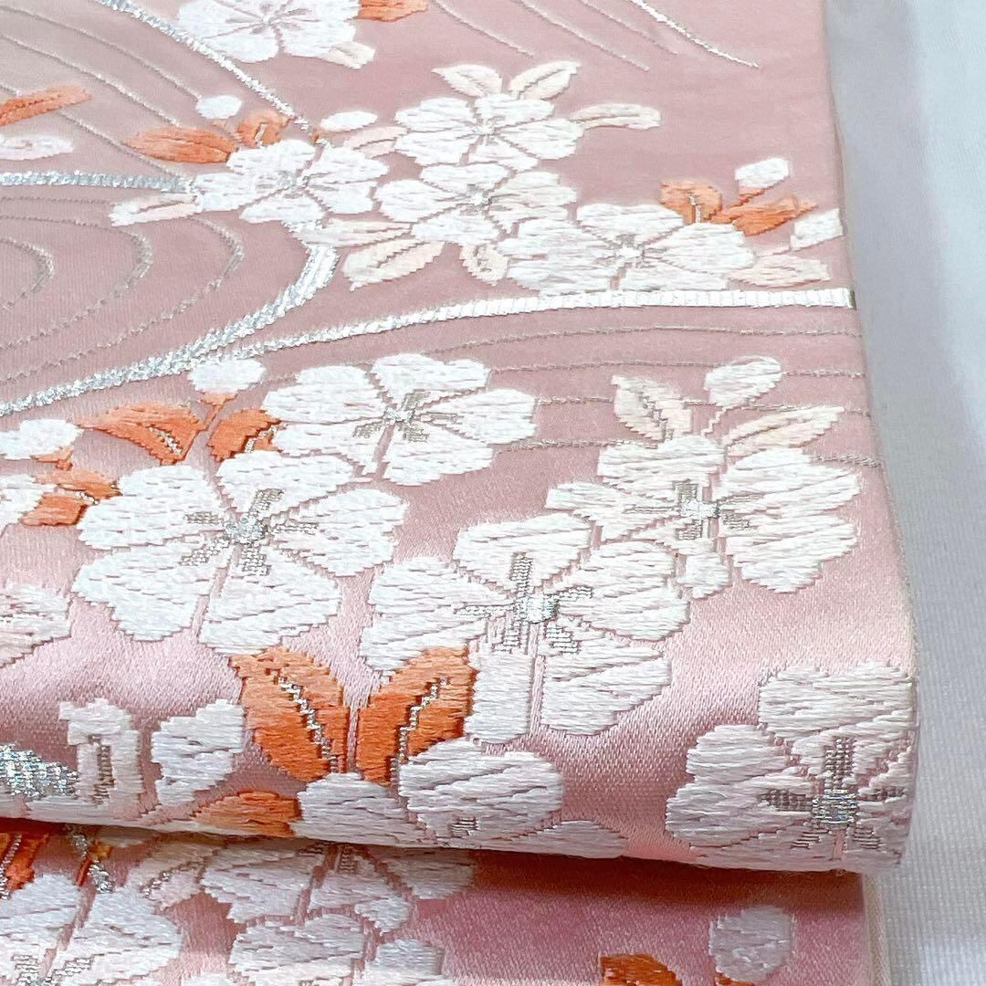縦にピンクのグラデーション地に銀の波模様と淡いピンクの桜花模様が可愛らしく華やかな一着です。
