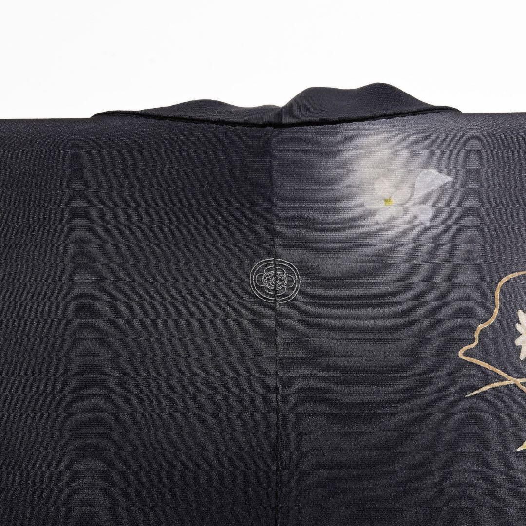 紬の黒に近い深いグレーの地に蛍ぼかしと花模様に花影の文様が目を惹く華やかでお洒落なデザインの一着です。