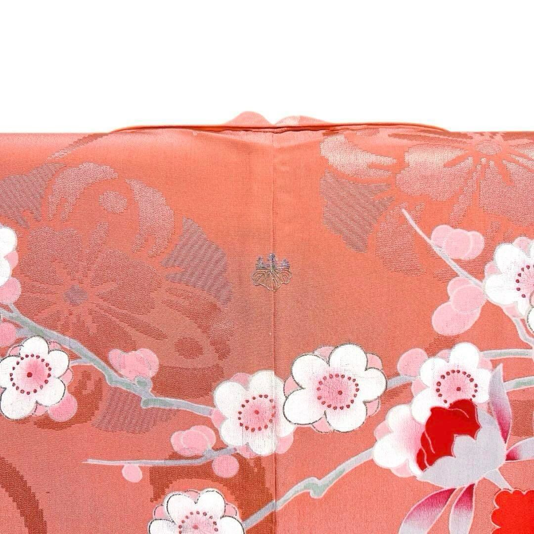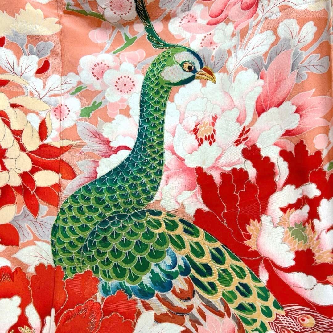 オレンジのかかったくすみピンクの地に刺繍を交えた孔雀に牡丹や菊、梅の文様が目を惹く華やかなデザインの一着です。