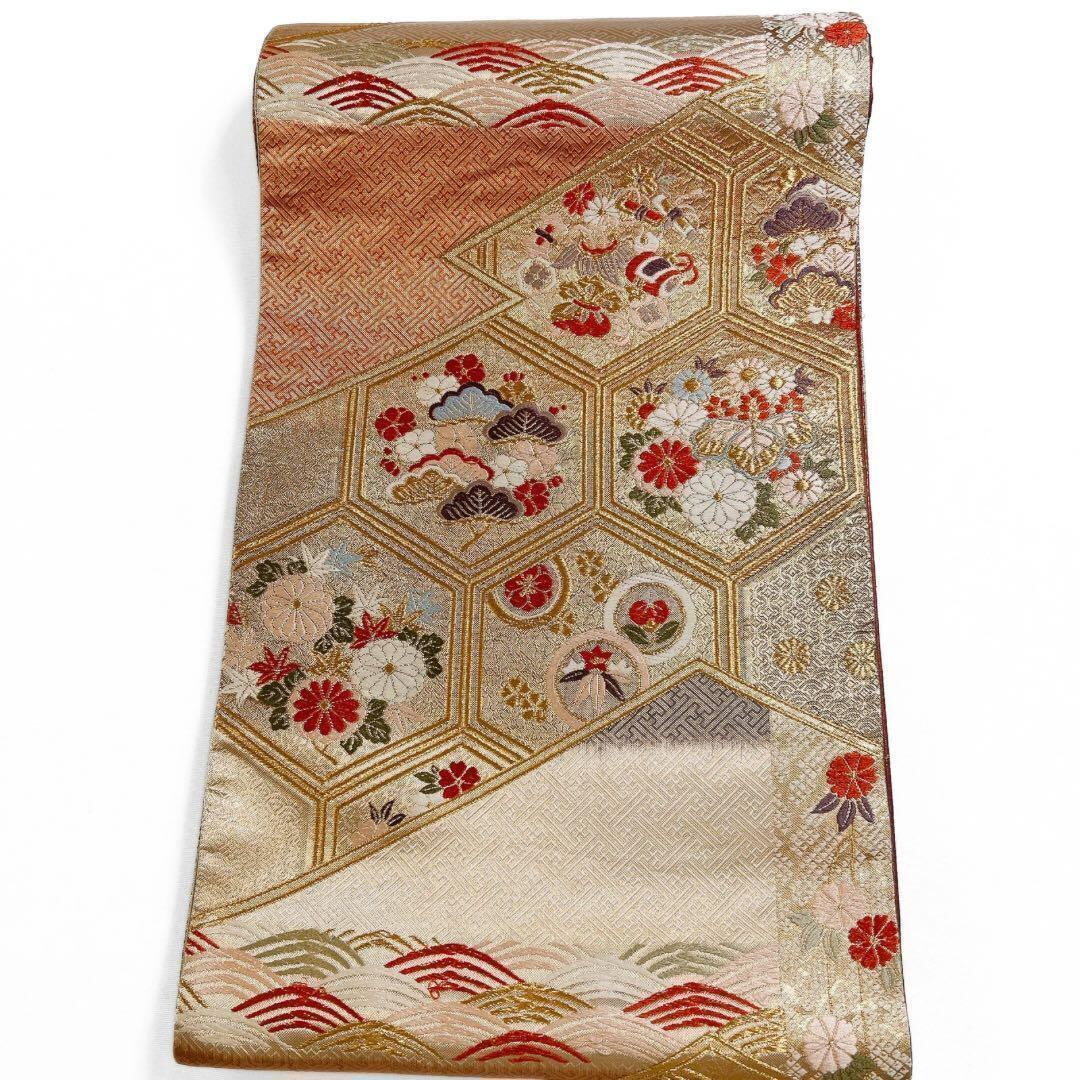 紗綾形に六角、菊花、宝尽くし模様の袋帯です。