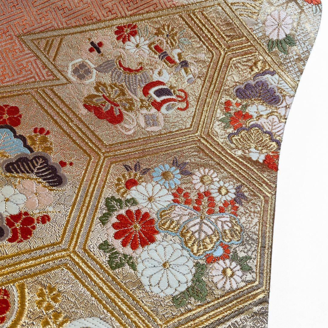 織り出された宝尽くしや松模様が華やかな印象の一着です。