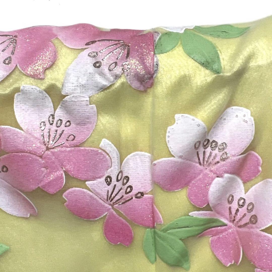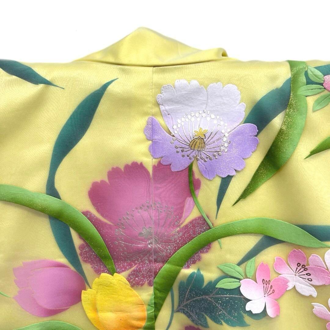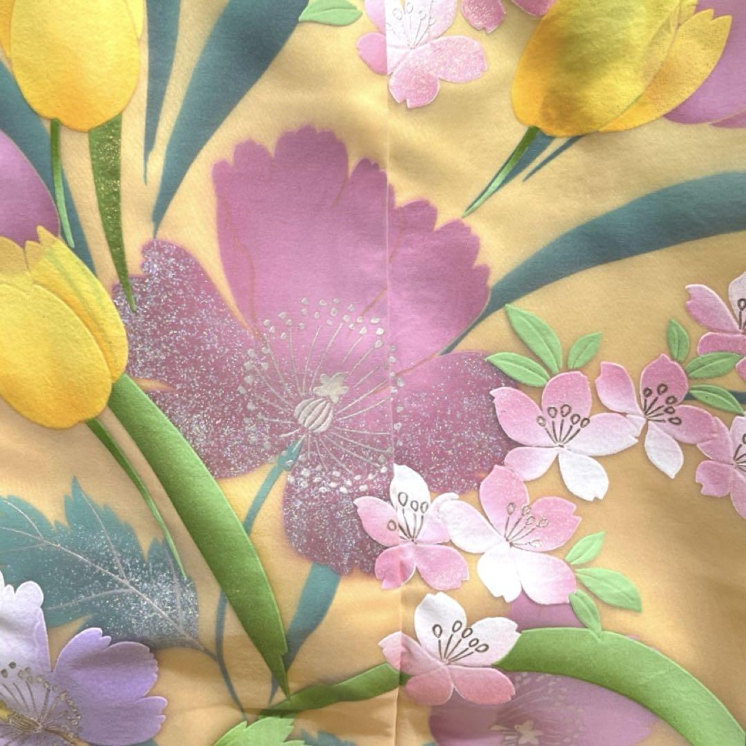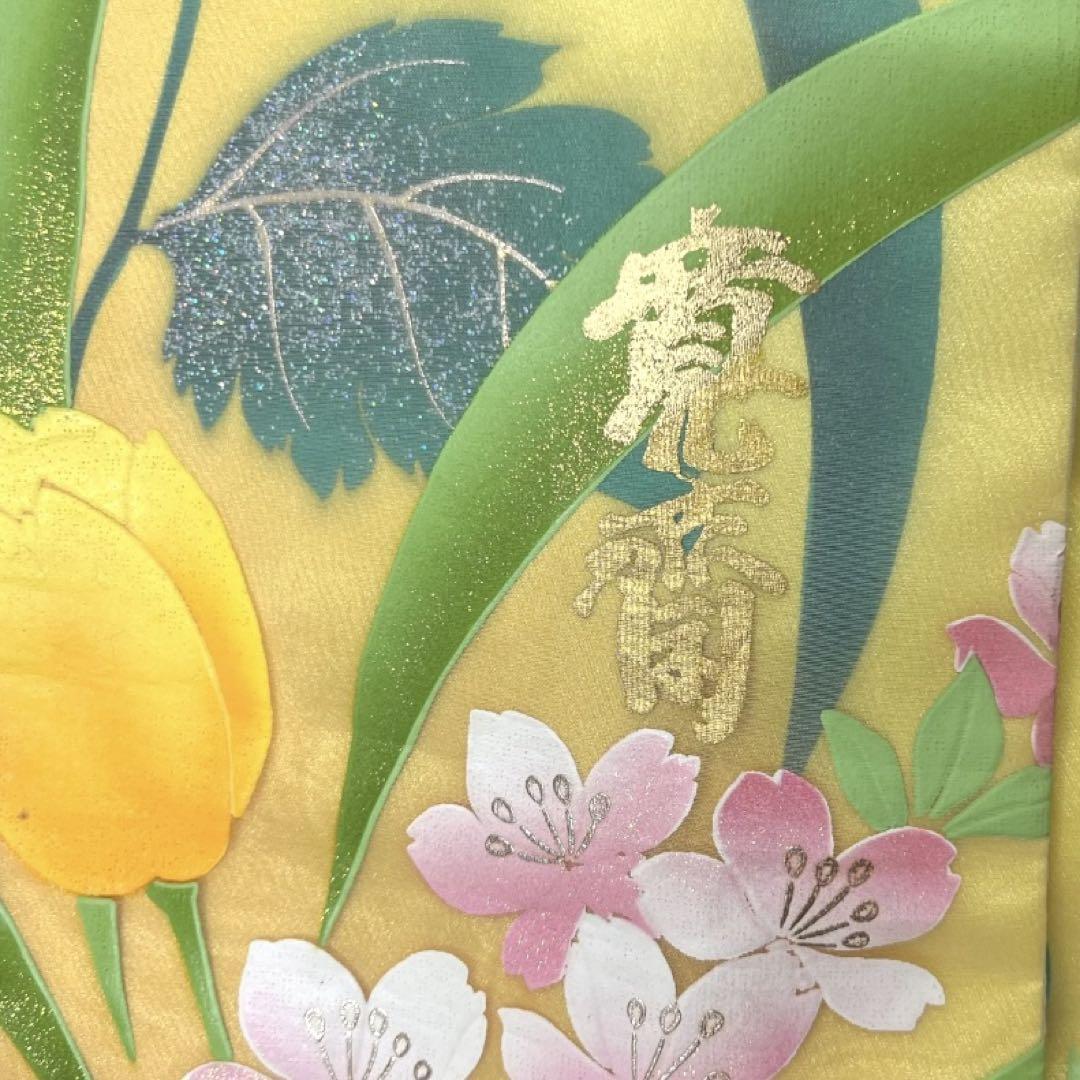 鮮やかなイエローの地とオーガンジーの二重になった地に銀彩を交えて描かれた桜やチューリップの文様が華やかなデザインの一着です。