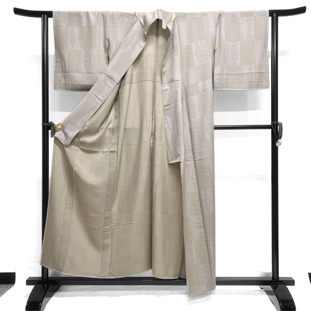 くすんだベージュの地に縦縞と杉綾文様の市松模様がお洒落なデザインの一着です。