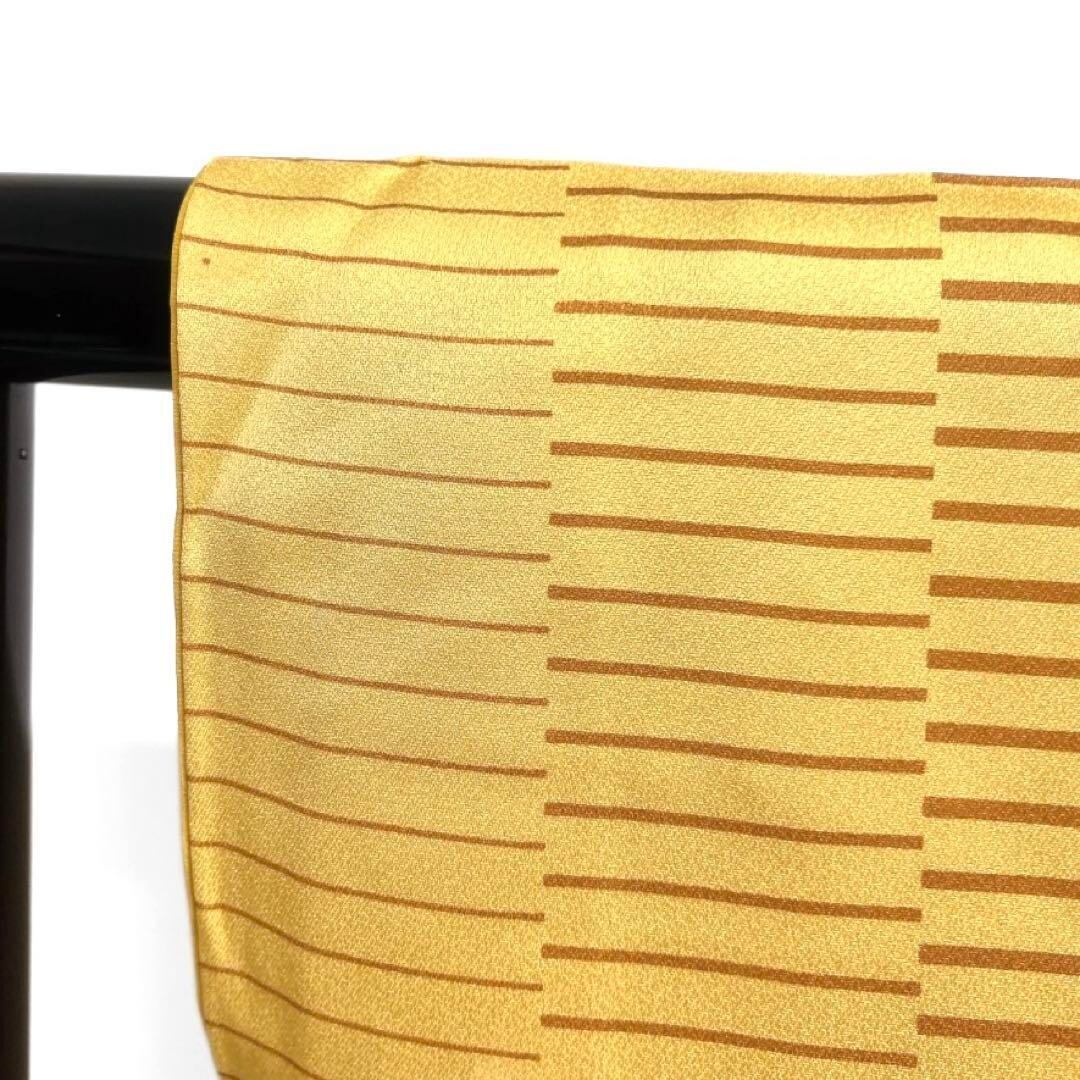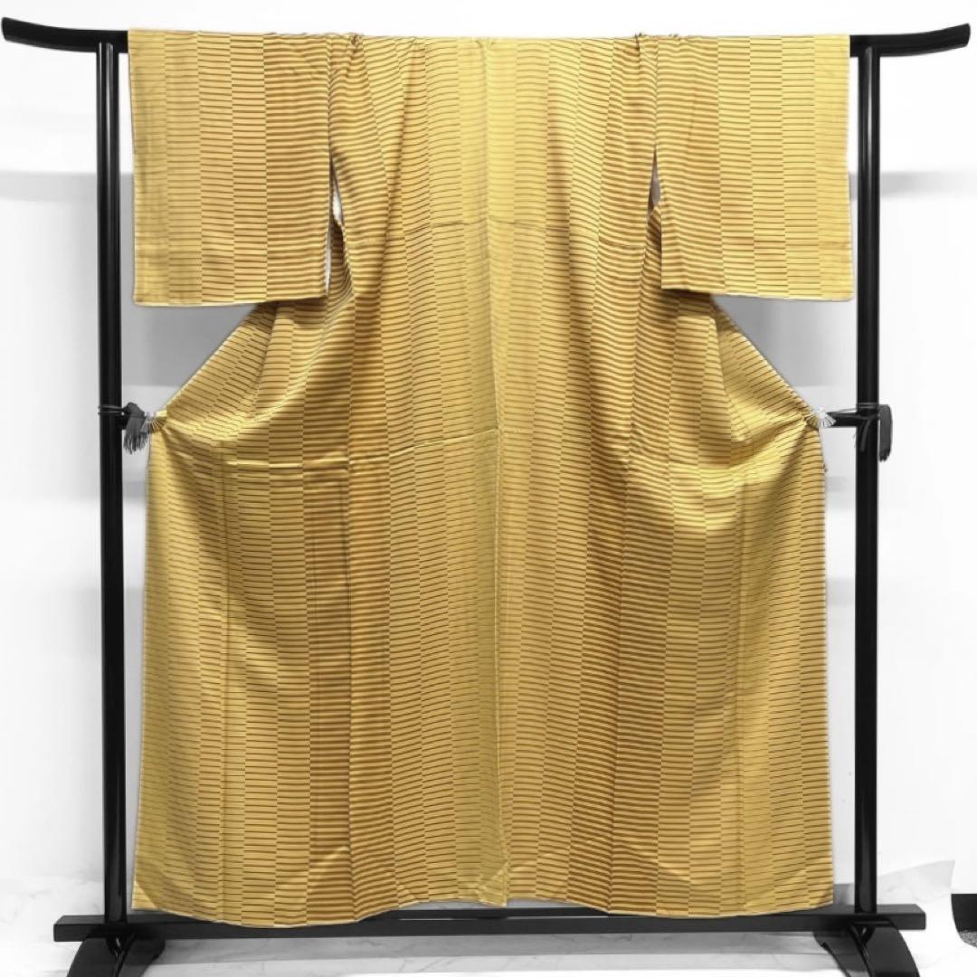 鮮やかなくすみのあるイエローの地にブラウンの変わり横縞の文様がお洒落なデザインの一着です。