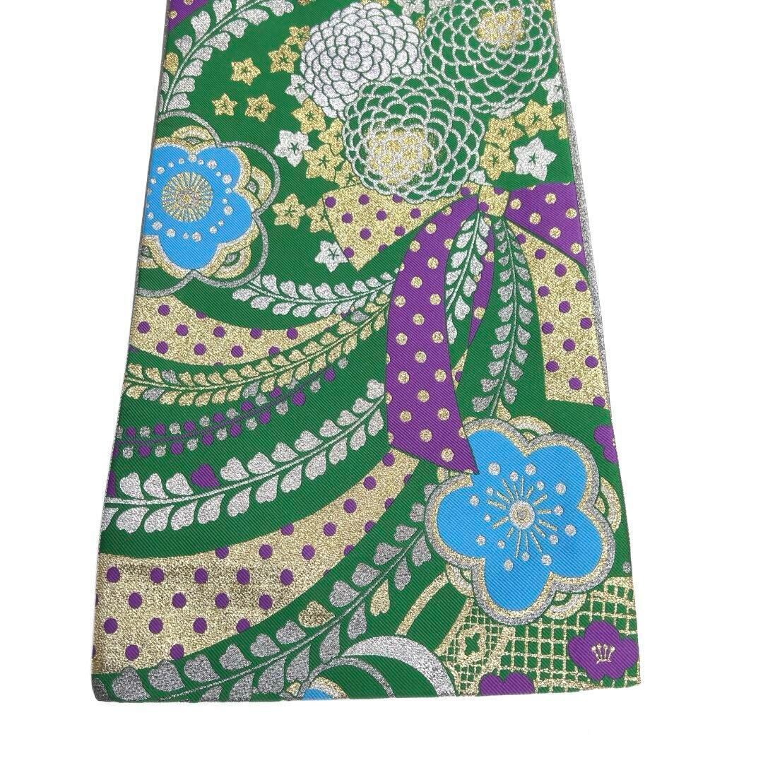 グリーンの地に映えるゴールドとパープルのドットとリボンの文様に花模様が織られた華やかなデザインの一着です。
