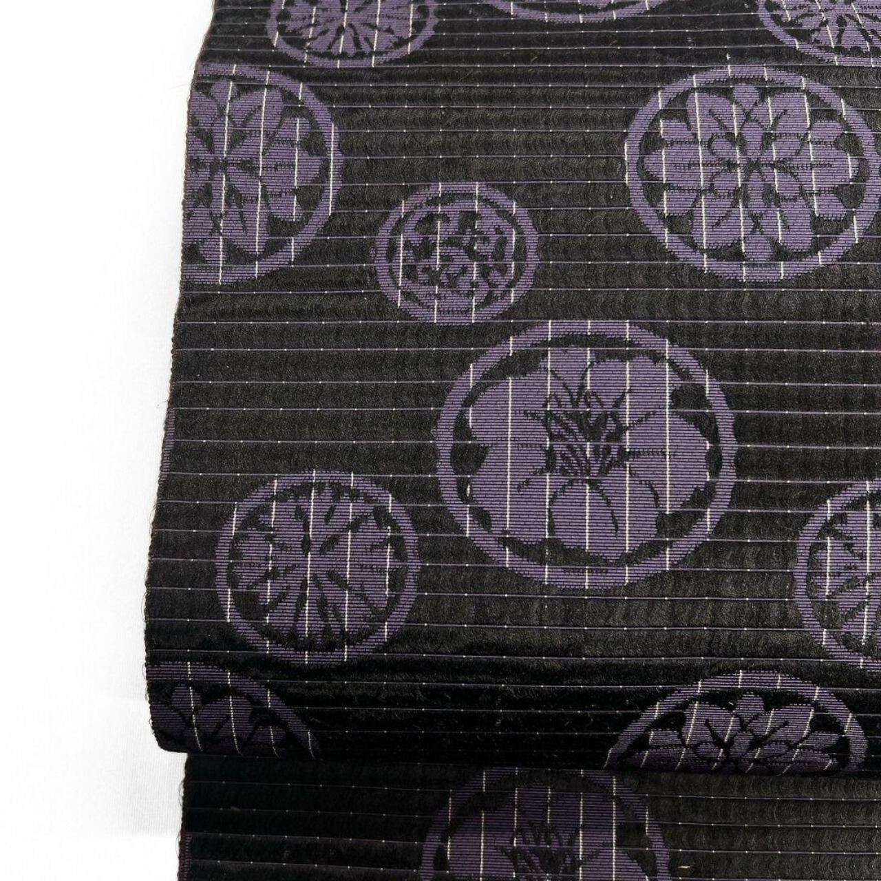 黒地に紫の細やかな織りと立体的な黒地部分の細やかな織りが美しい一着です。