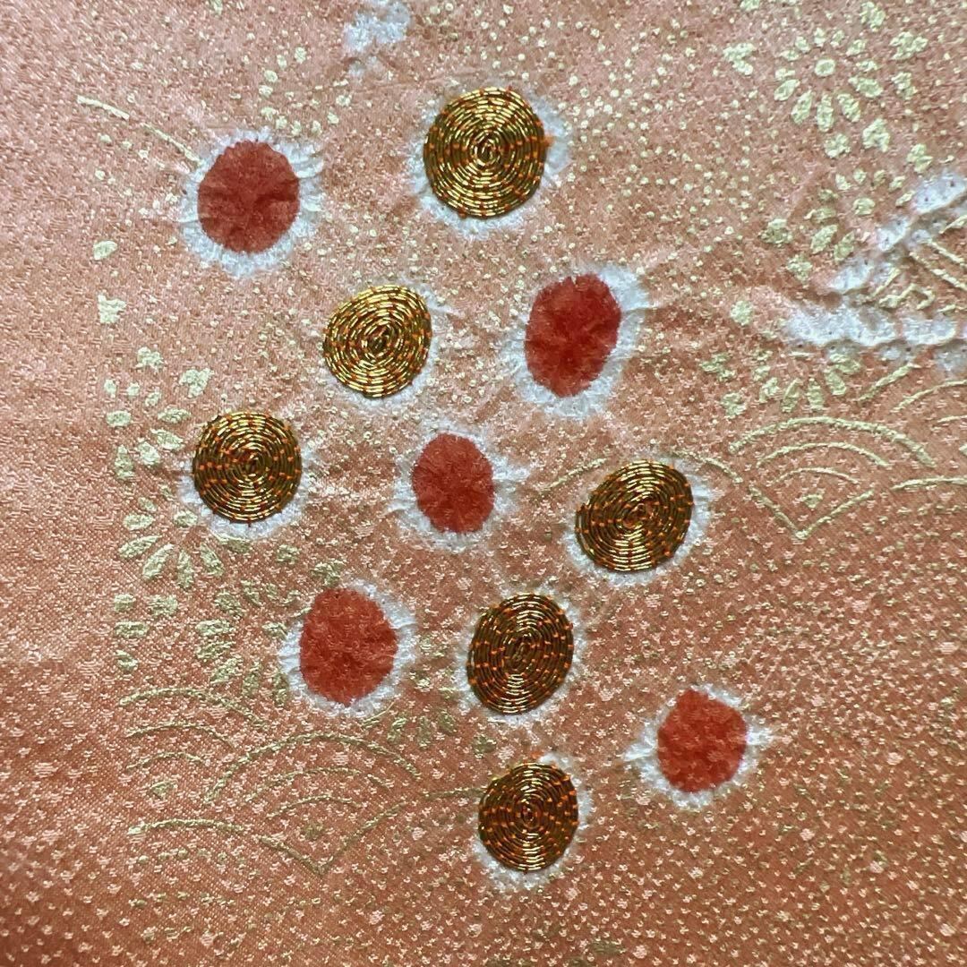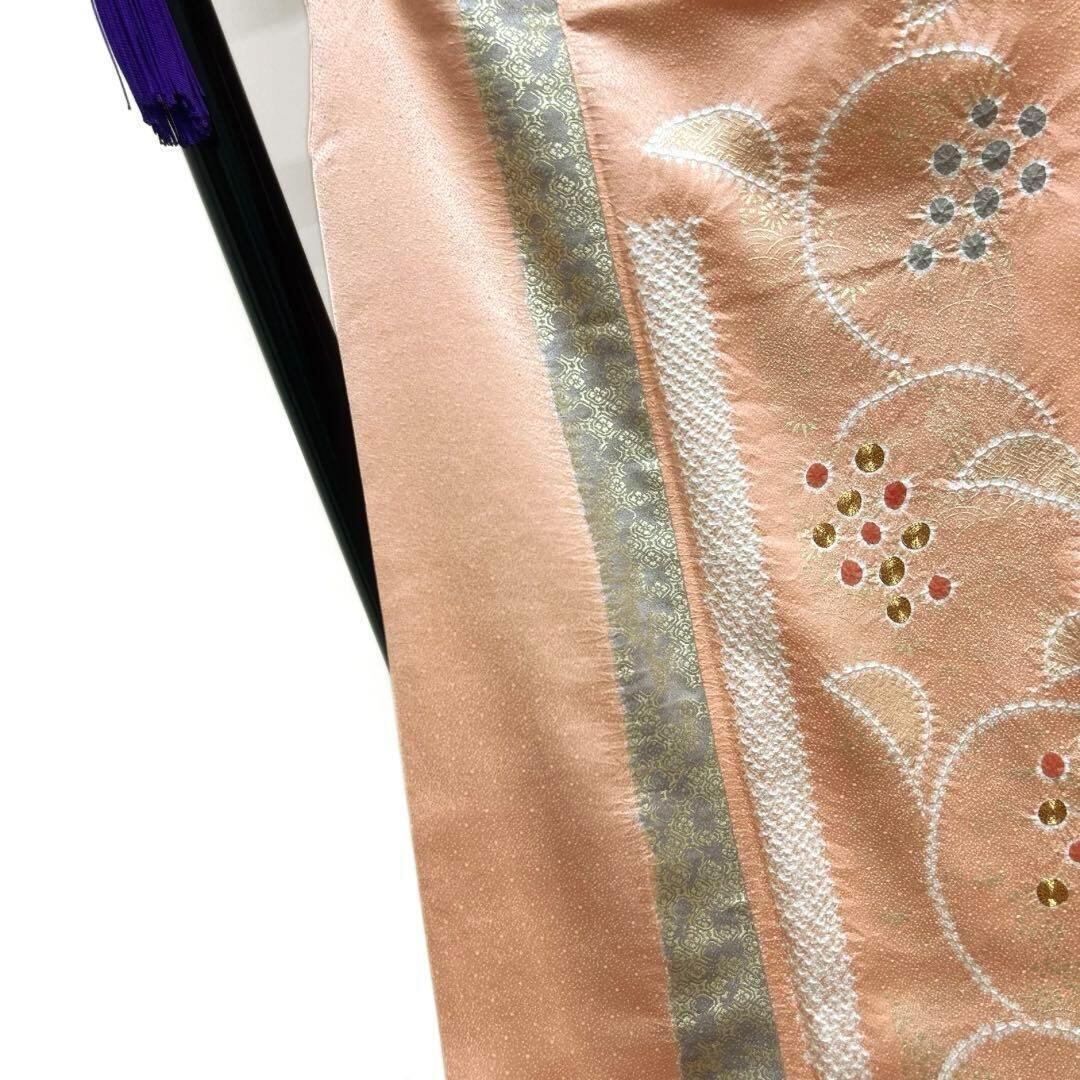 薄いオレンジの地に金駒刺繍を交えた絞りの葡萄模様と縦に金彩の蜀江紋模様が華やかな一着です。