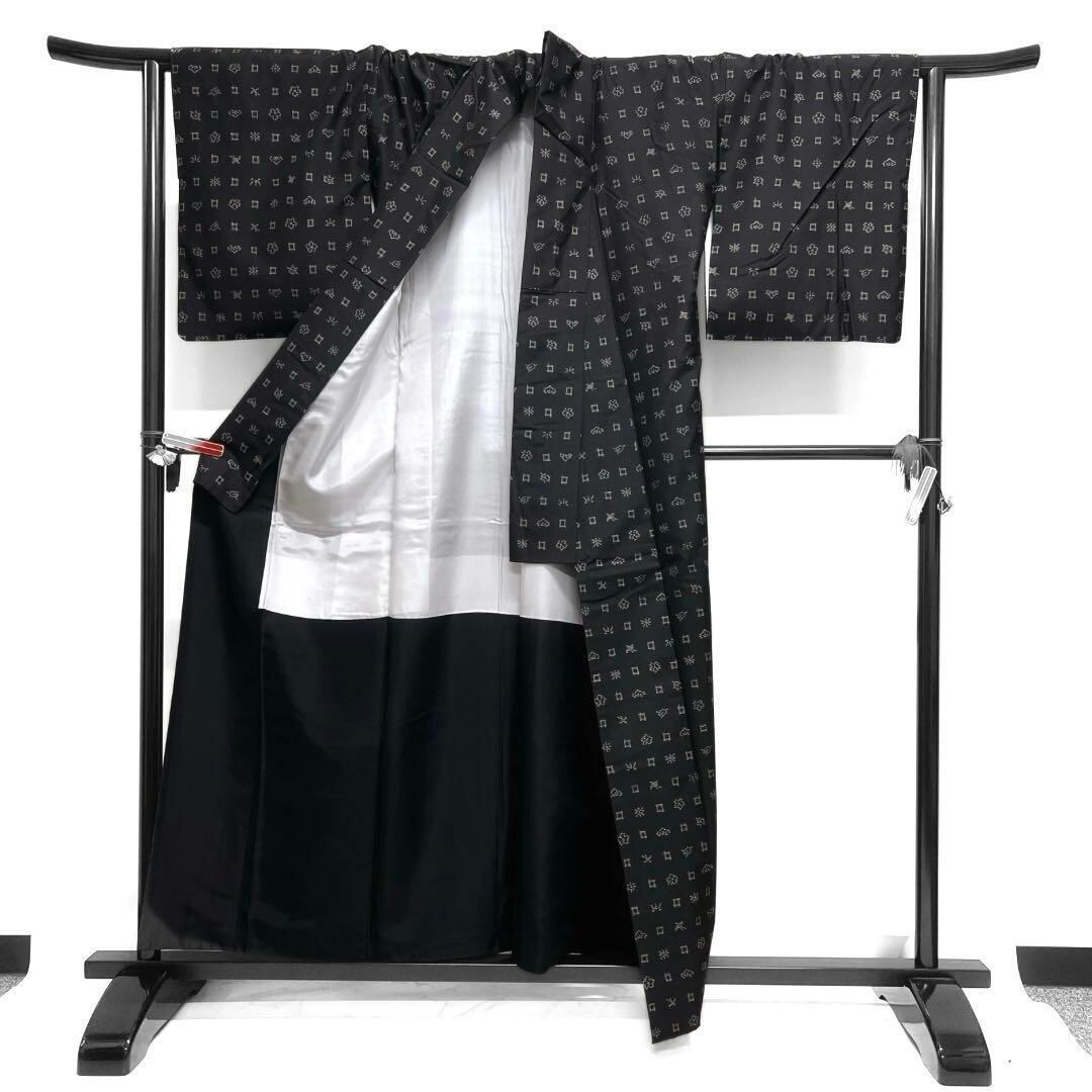 泥染の地に地空きで織られた千鳥に松竹梅、菊の文様がお洒落なデザインの一着です。