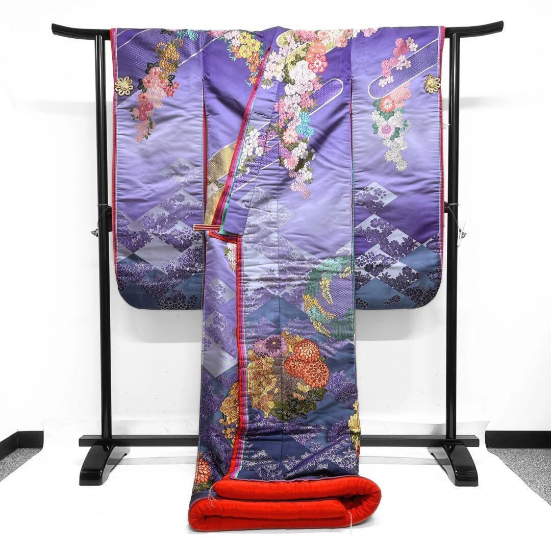 パープルのグラデーション地に枝垂れの菊や桜、梅の花模様と花紋、蝶の文様が織られた華やかで絢爛な一着です。