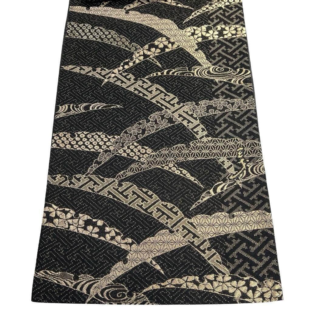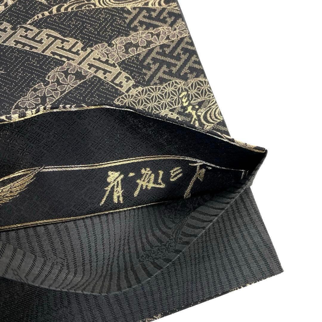 黒地に金糸で織られた紗綾形に露芝に桜や鹿の子、麻の葉、観世水が織られた華やかなデザインの一着です。