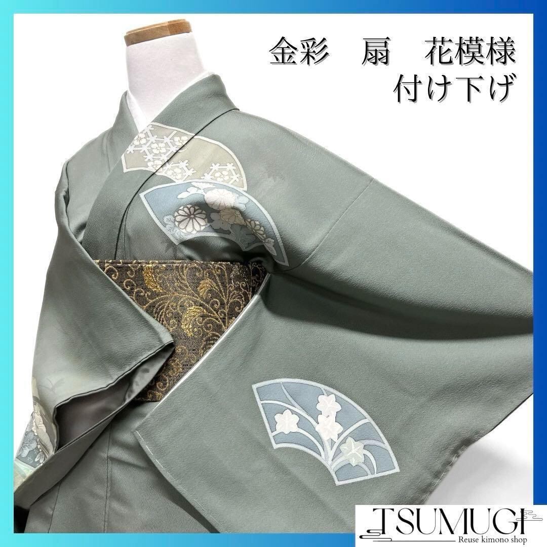 深いくすみグリーンの地に松葉や楓と扇に金彩を交えた様々な花模様が描かれた華やかな一着です。