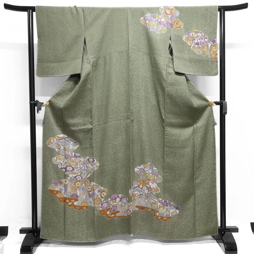 くすみカラーのグリーンの膨れ織地に雲に菊や網干、松竹梅に梅や流水が型染めで描かれた華やかなデザインの一着です。