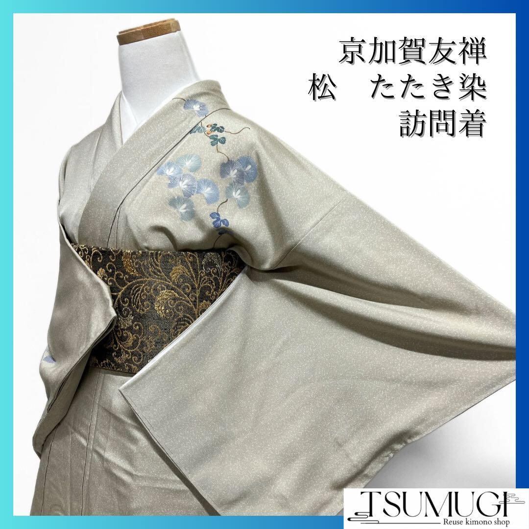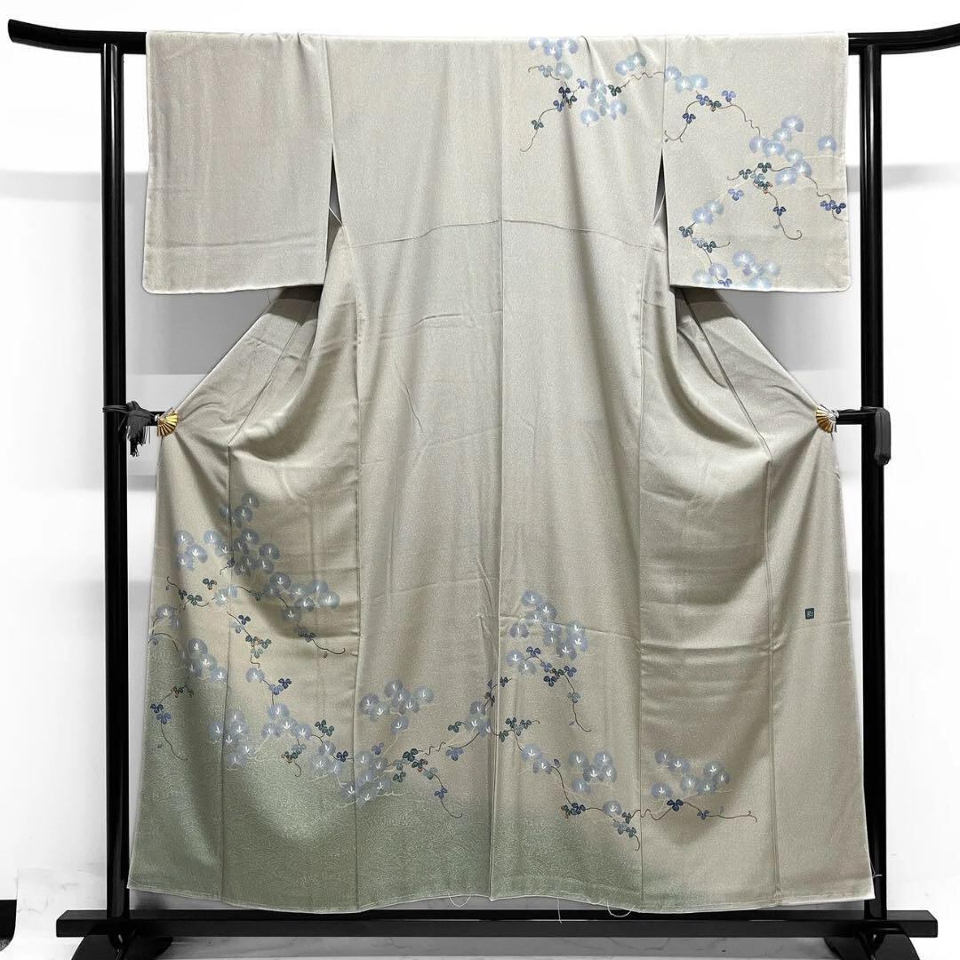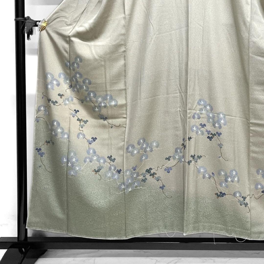 グレーに近いくすみカラーの薄いグリーンのたたき染地に京加賀友禅で描かれた松とリーフ、蔦の文様が華やかなデザインの一着です。