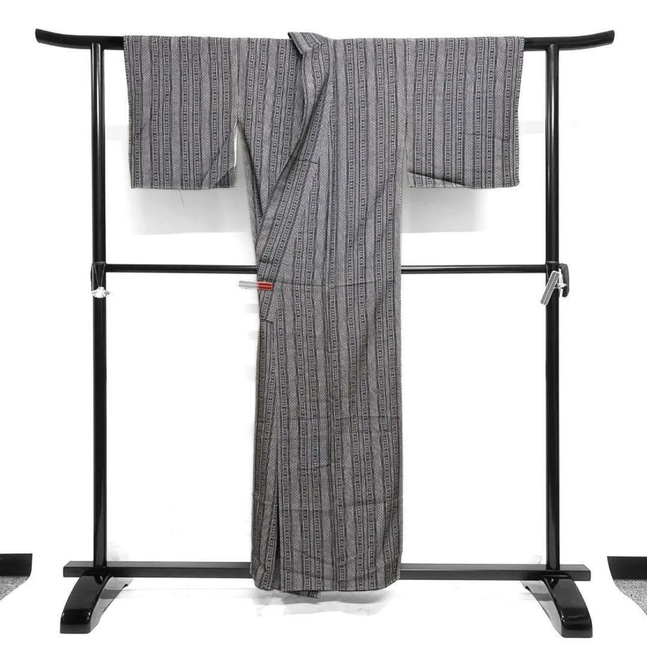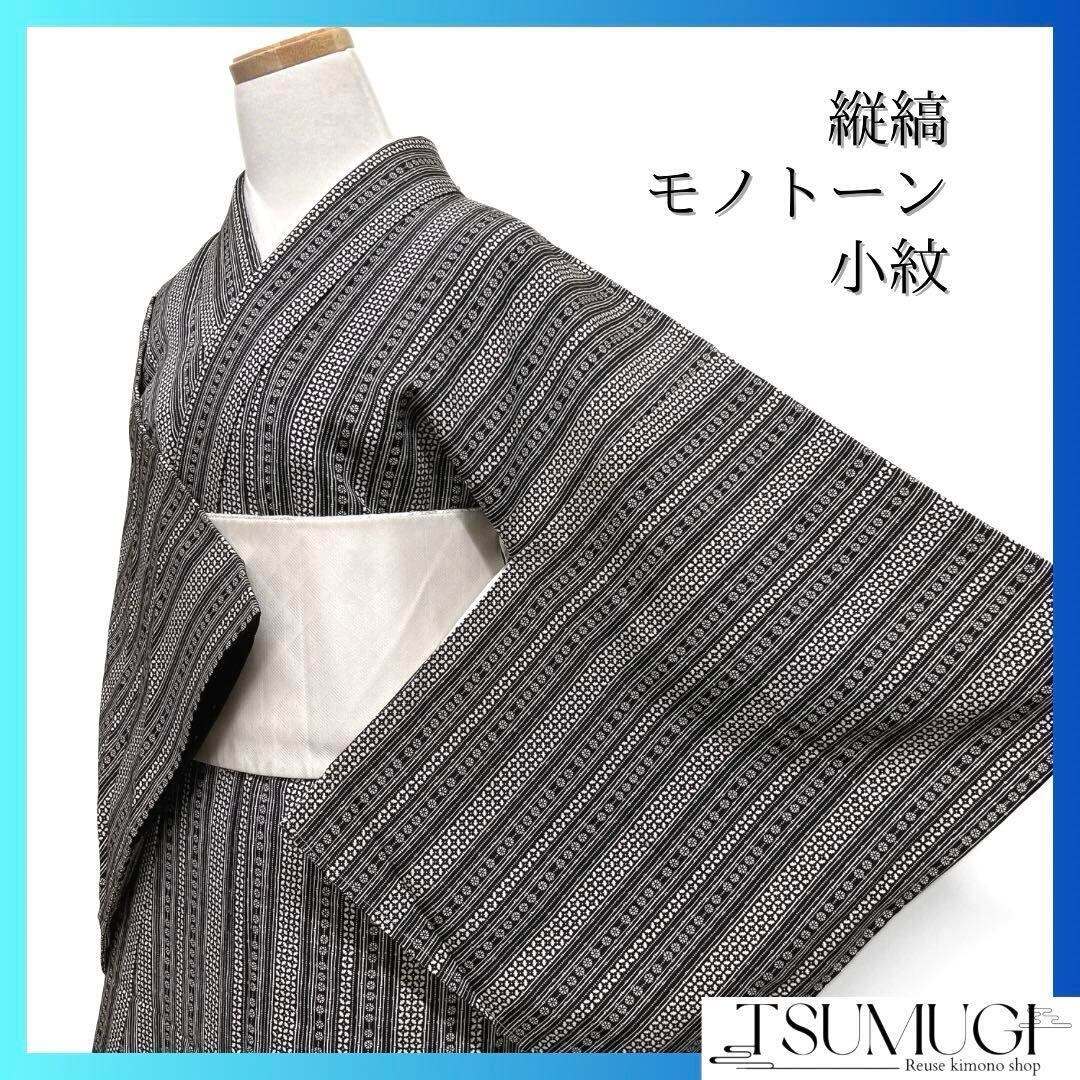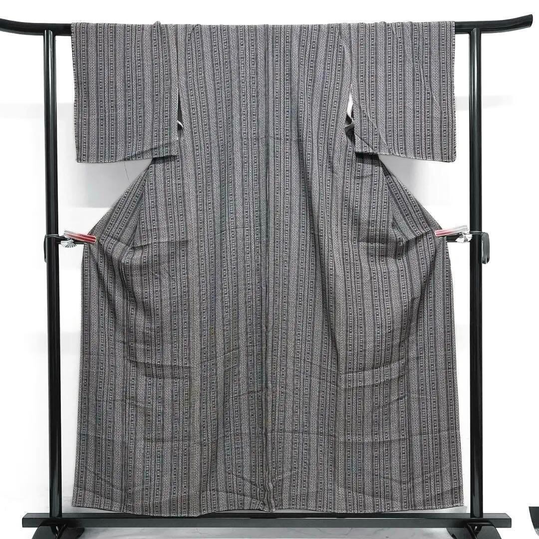 ホワイトとブラックのモノトーンで描かれた縦縞に菊花や七宝、竹筋がお洒落なデザインの一着です。