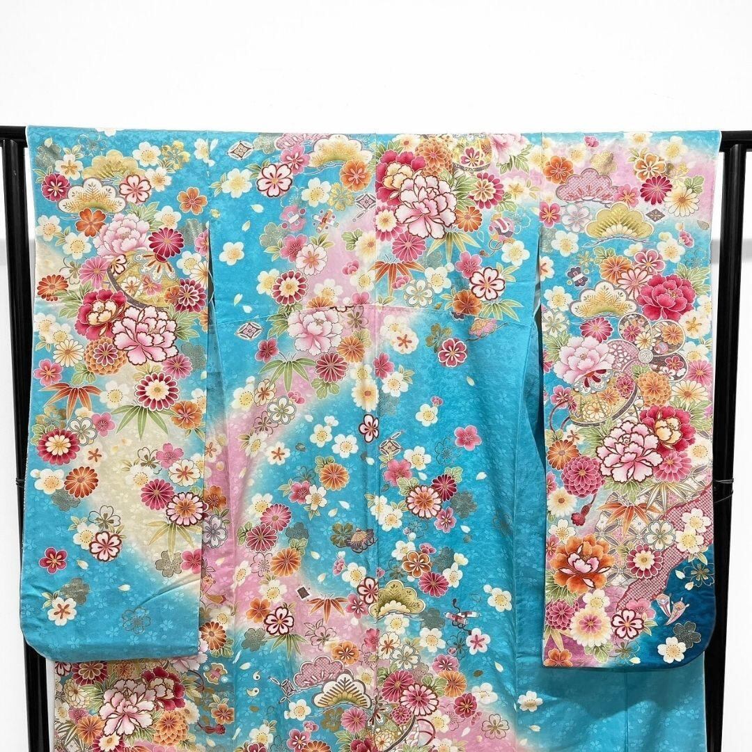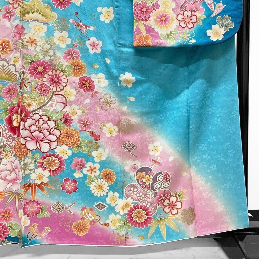 彩を感じる華やかなお色味に松竹梅や花菱、鞠などの伝統和模様が華やかにデザインされた一着です。