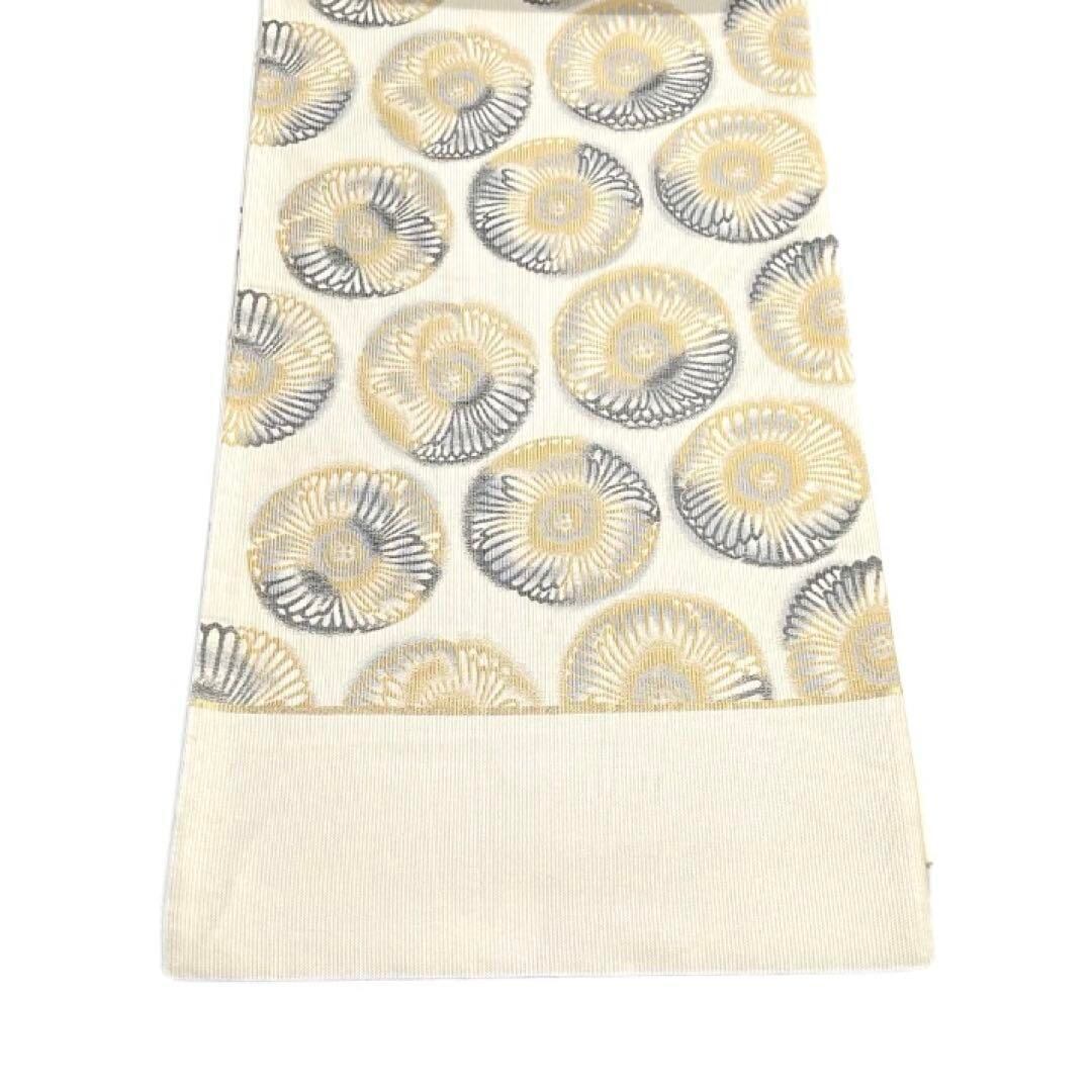 オフホワイトの地にグレーと濃いイエローで織られた菊花の文様が華やかなデザインの一着です。