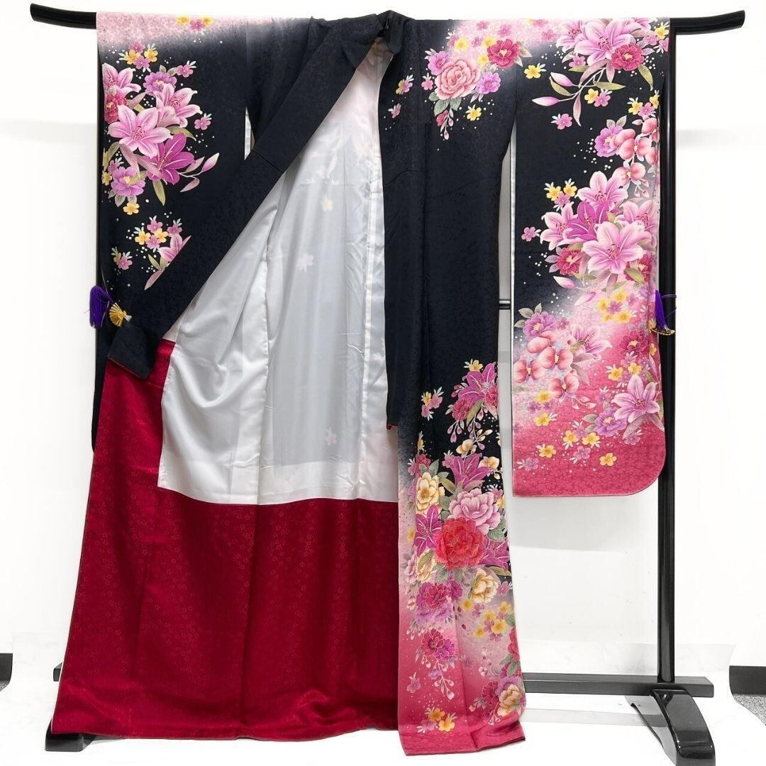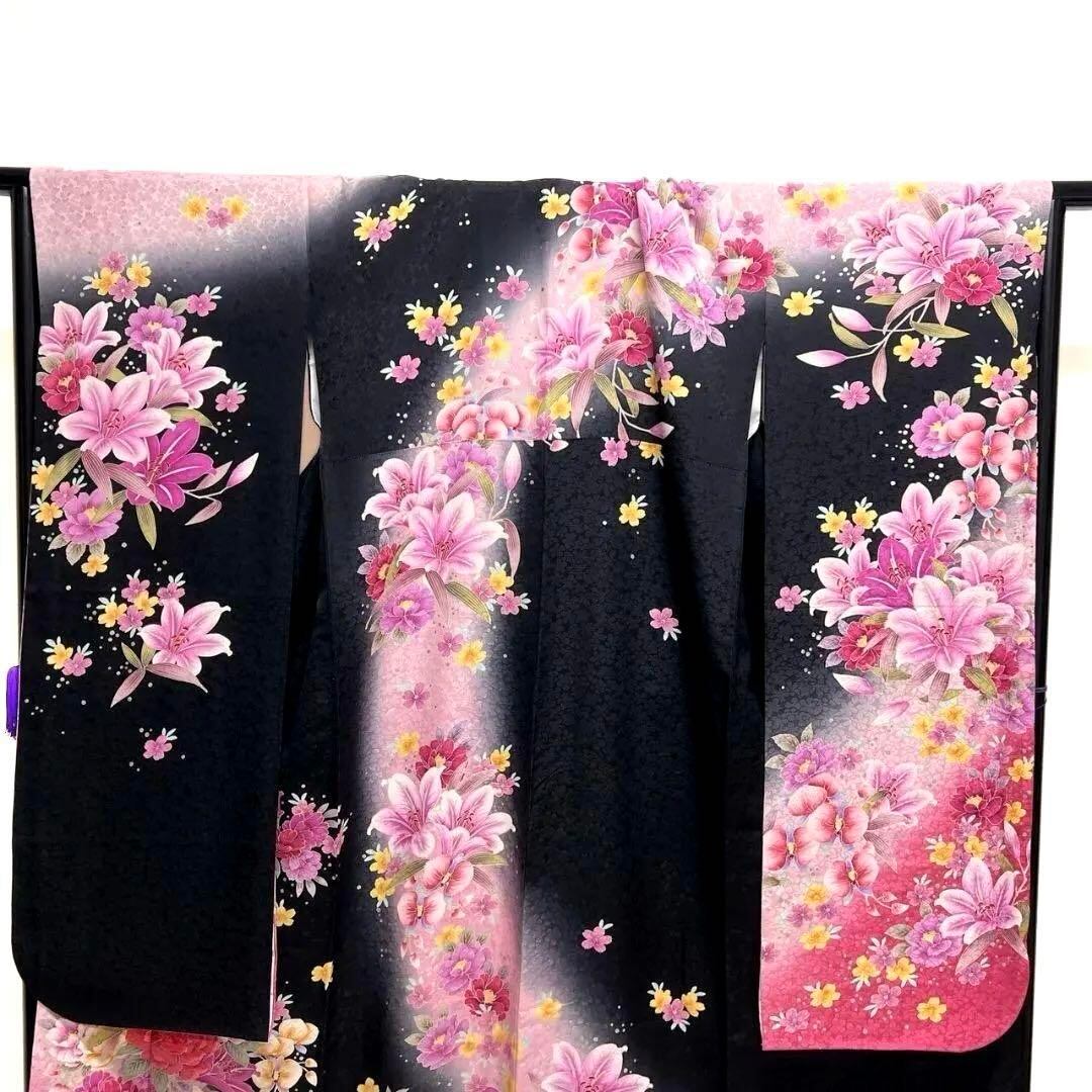 黒地に鮮やかな牡丹や百合、胡蝶蘭が華やかに描かれた一着です。