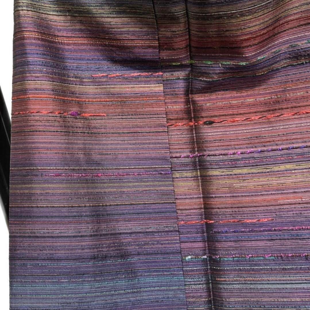 紬で織られた光沢感のあるパープルを基調にグラデーションのあるカラフルな横縞の文様が目を惹くお洒落なデザインの一着です。