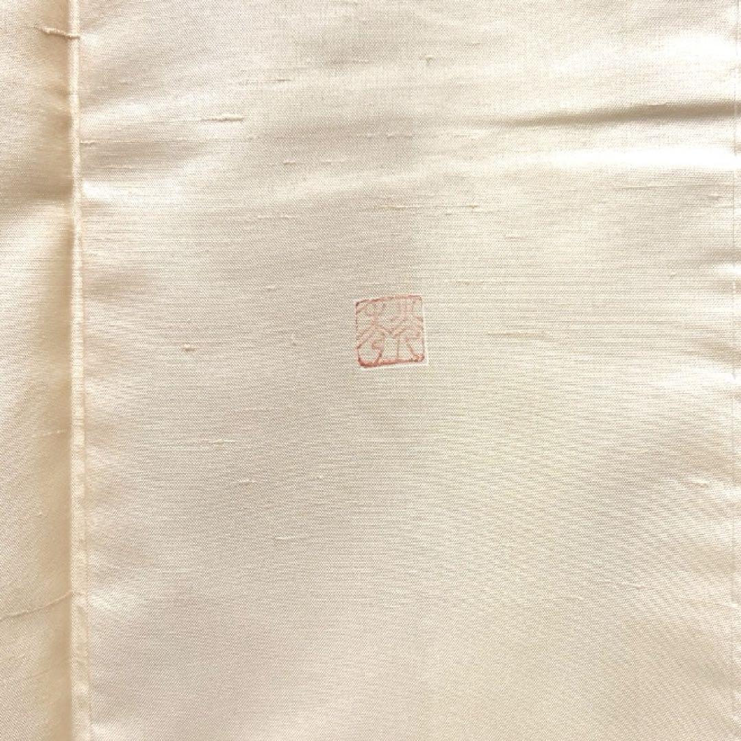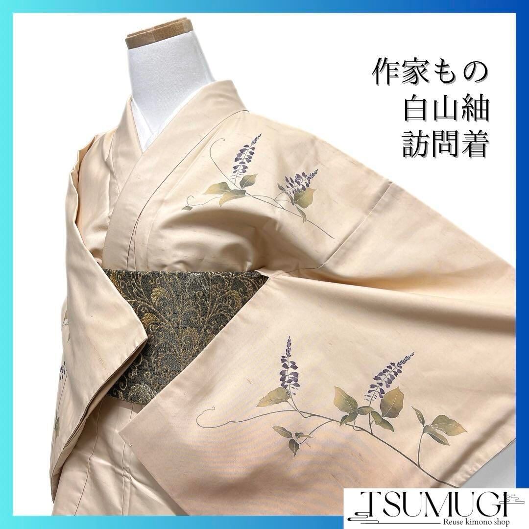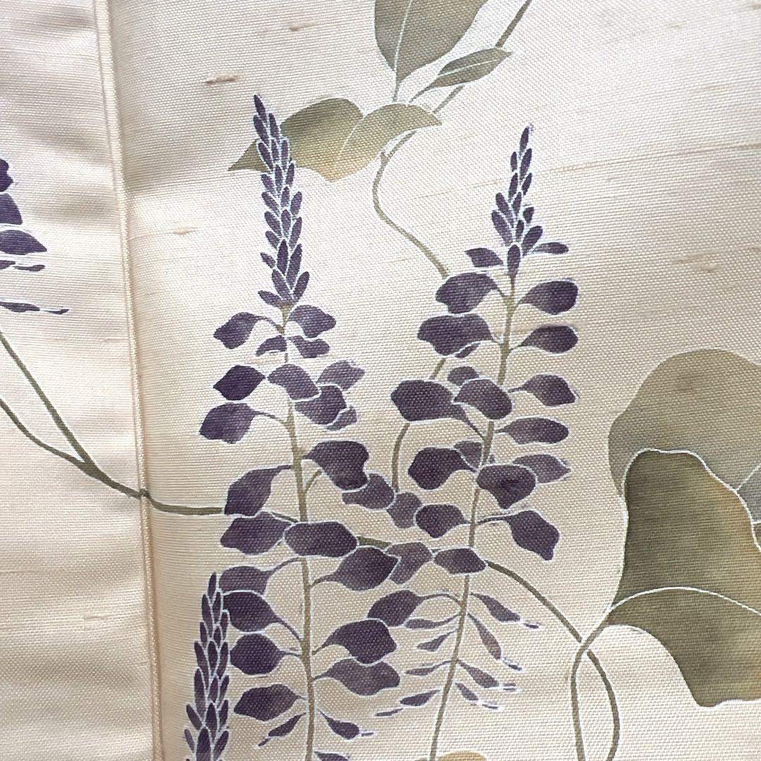 白山紬のベージュ地に映える紫の花模様とリーフ、蔦の文様が華やかなデザインの一着です。