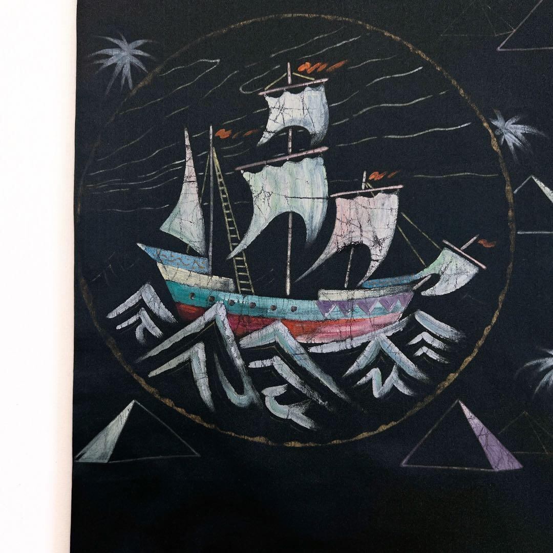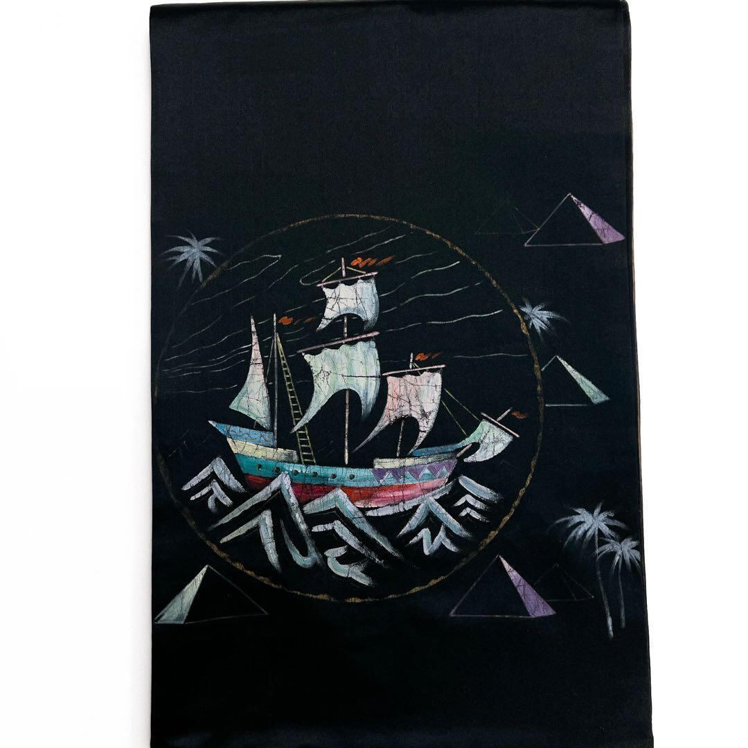 黒地に帆船とヤシの木、ピラミッドと砂漠が描かれた異国情緒溢れるアンティークの袋帯です。