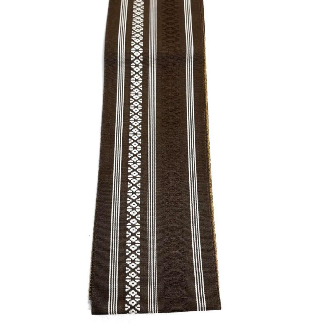 本場筑前博多織で織られた深いブラウンの地に白とブラウンで織られた献上模様が上品でお洒落なデザインの一着です。