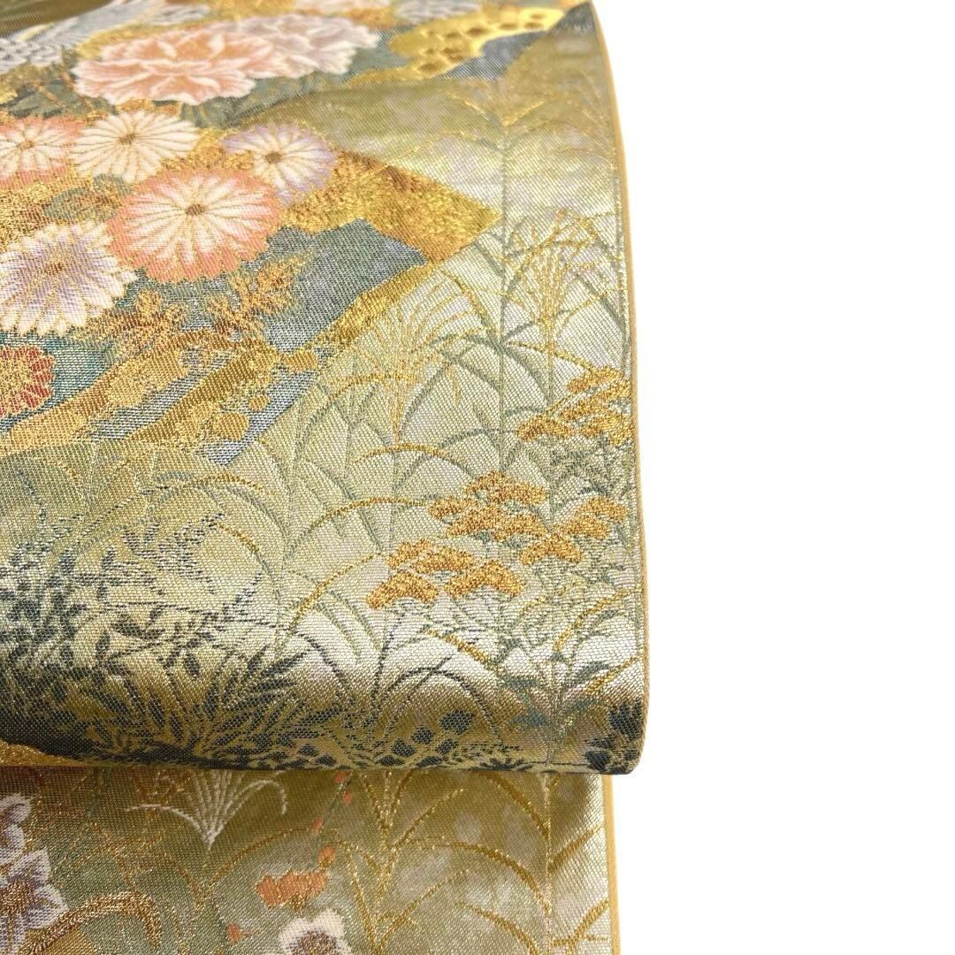 扇に花模様と鶴の袋帯です。