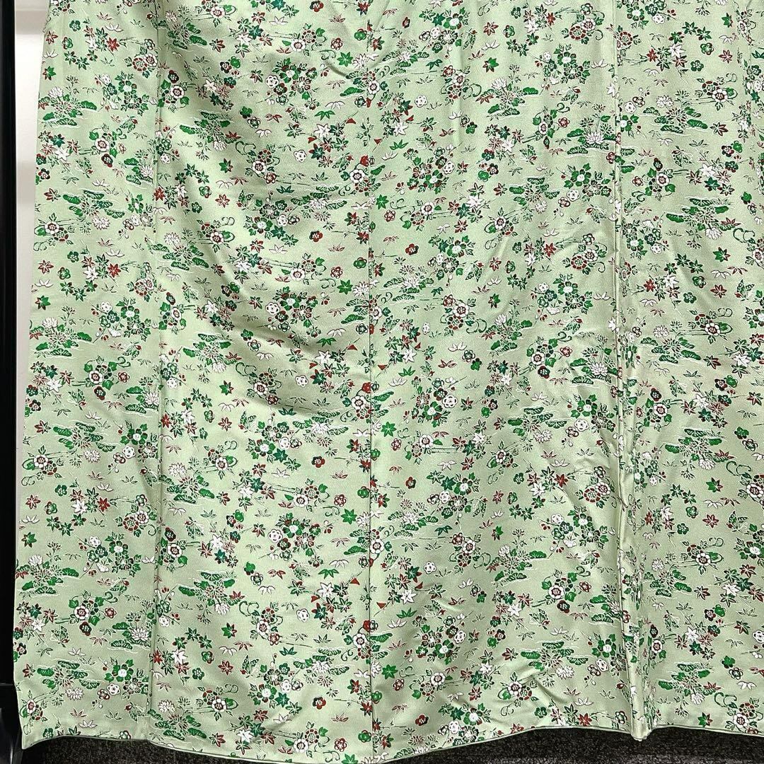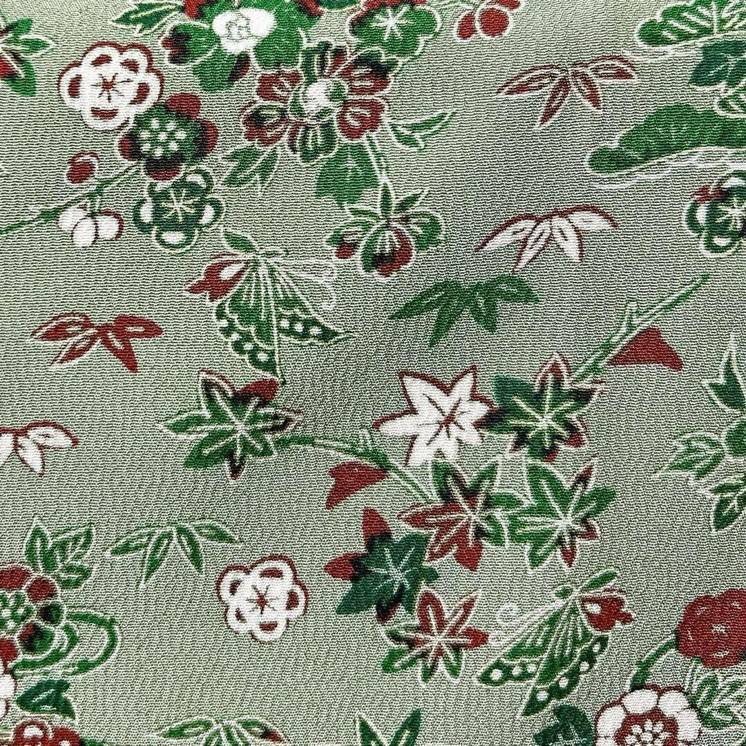 くすんだライトグリーン地に緑と赤紫を基調とした蝶や松竹梅に菊や楓が描かれた華やかでお洒落な一着です。