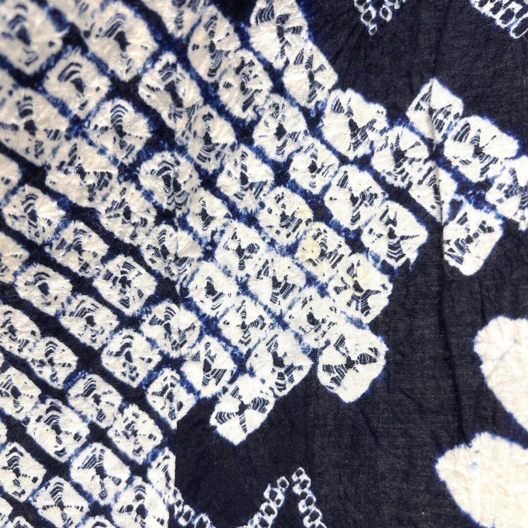 深いネイビーの地に有松鳴海絞りで描かれたひまわりと鹿の子の文様がお洒落なデザインの一着です。