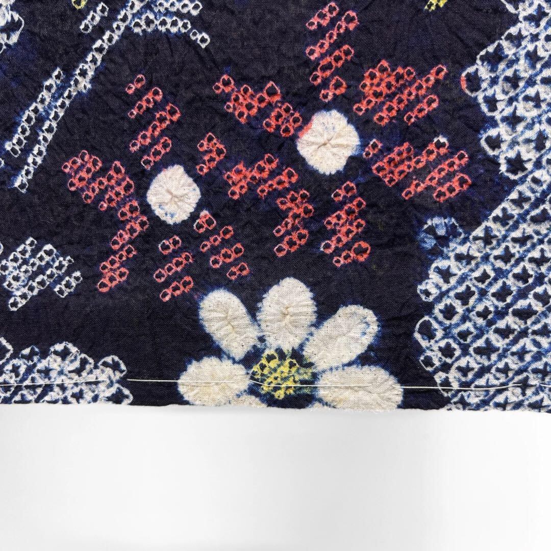 ネイビーの地に有松鳴海絞りで描かれた縦によろけの蔦と花模様がお洒落なデザインの一着です。