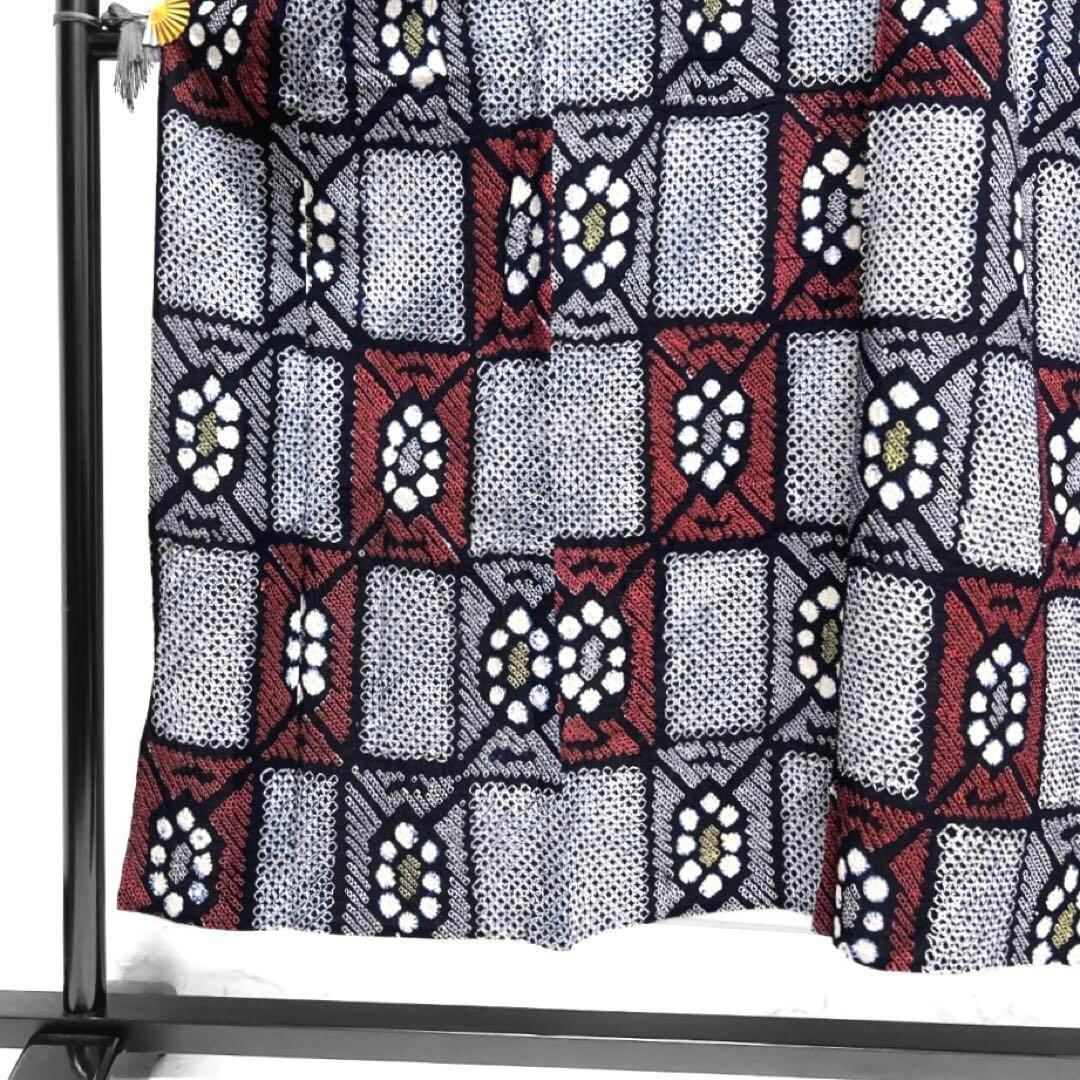 ネイビー地に有松鳴海絞りで描かれた花模様の市松模様と斜めに描かれた格子の文様がお洒落なデザインの一着です。