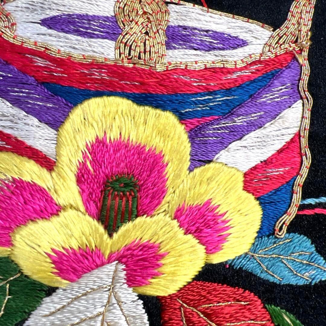 黒地に映える金駒刺繍とカラフルな刺繍で全て織られた牡丹と椿に糸巻き器の文様が華やかなデザインの一着です。