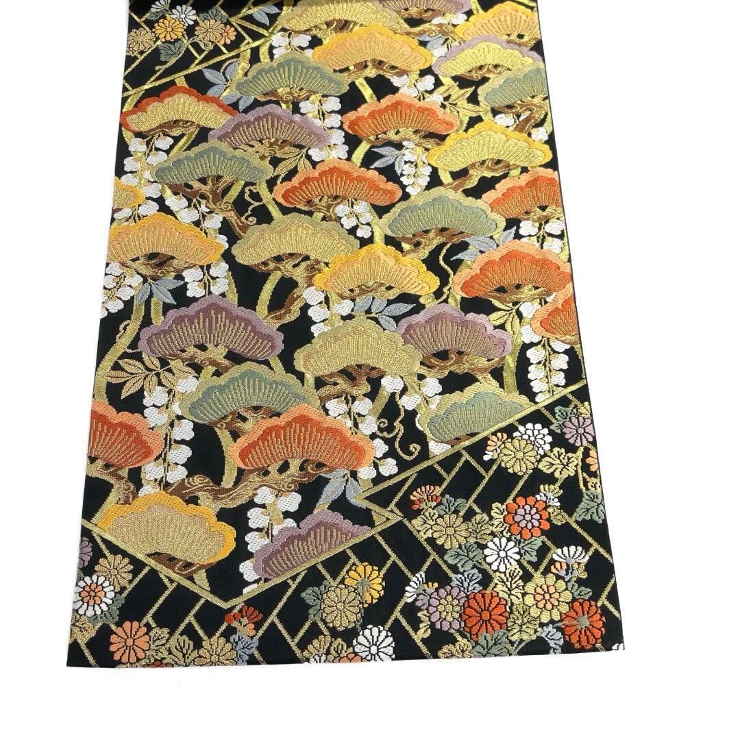 黒地に映える金糸を交えたカラフルな松と菊の文様が華やかなデザインの一着です。