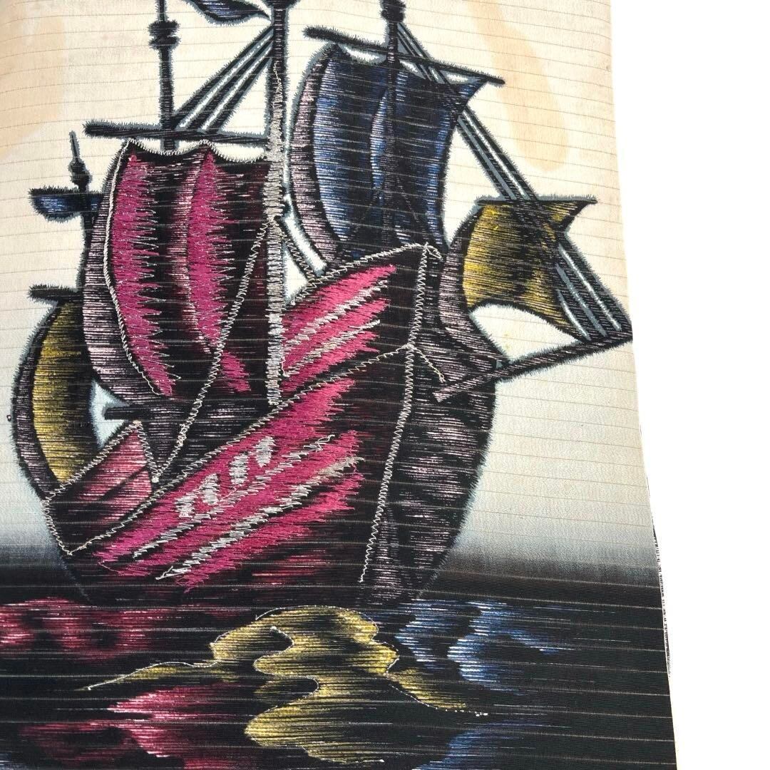 白地の絽の地に映える銀糸を交えた大ぶりの南蛮船の文様が目を惹く華やかなデザインの一着です。