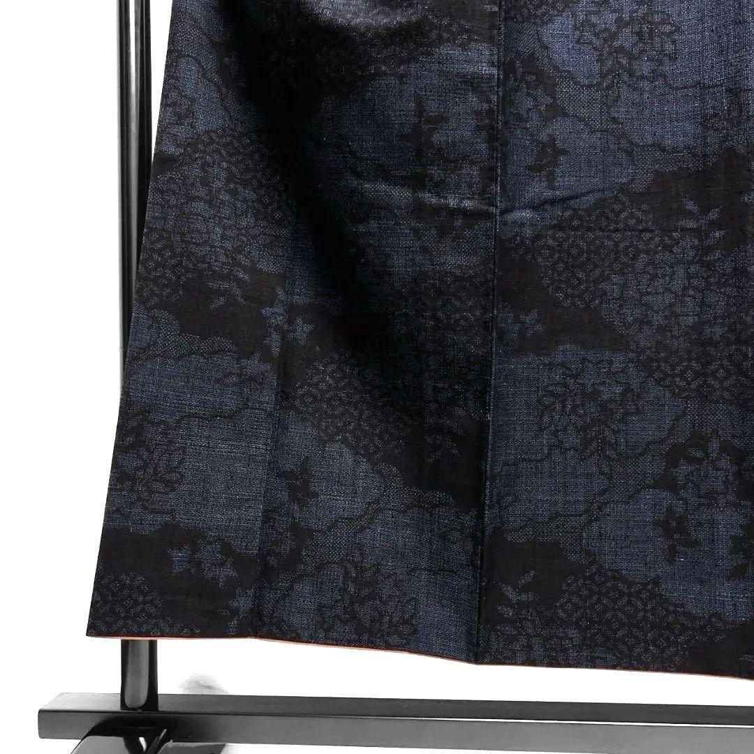 本場結城紬の雲や花模様、七宝が織り出された小紋です。
