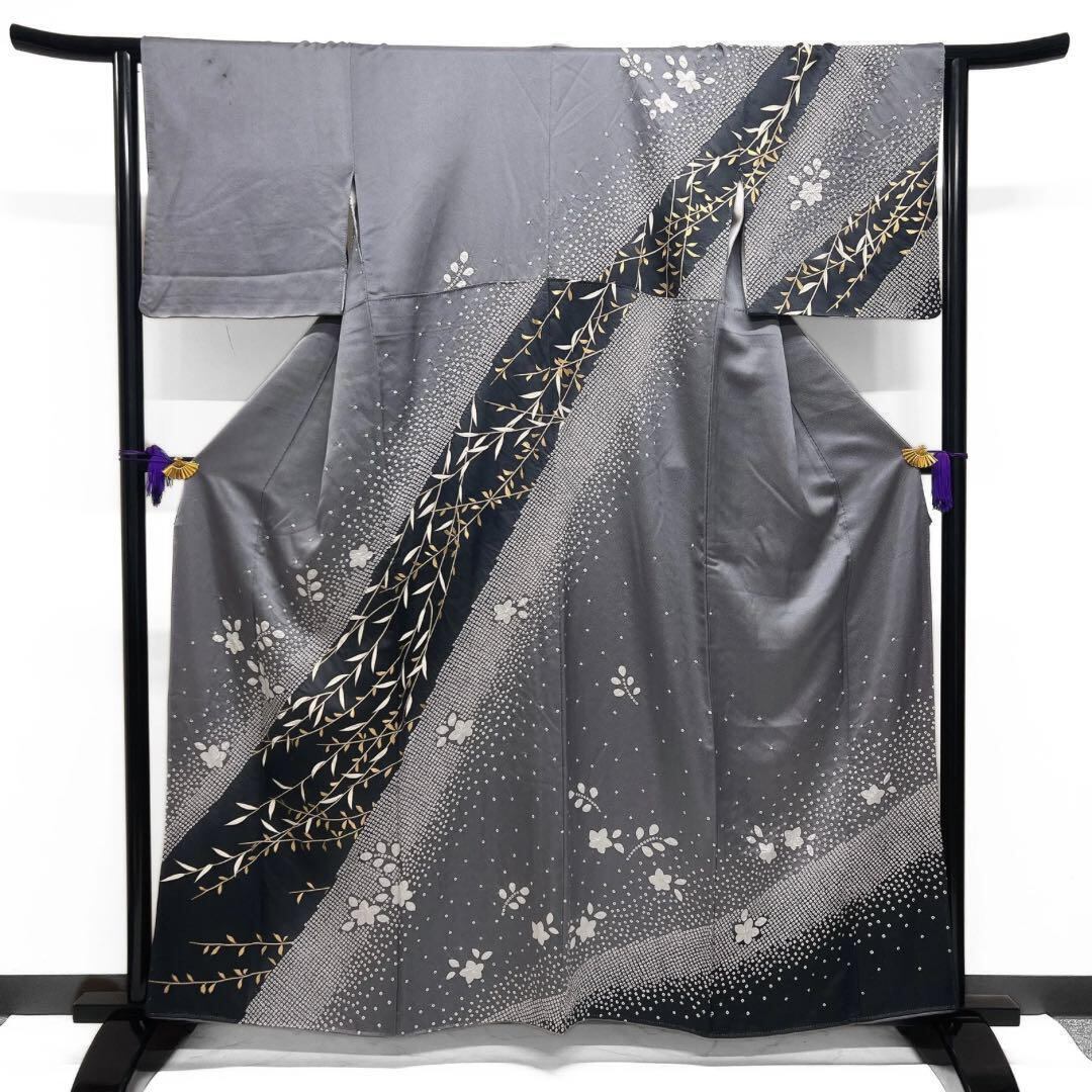 紗綾形地紋の深いグレー地に斜めに描かれた金彩を交えた竹と絞りの鹿の子や梅の文様が華やかな一着です。