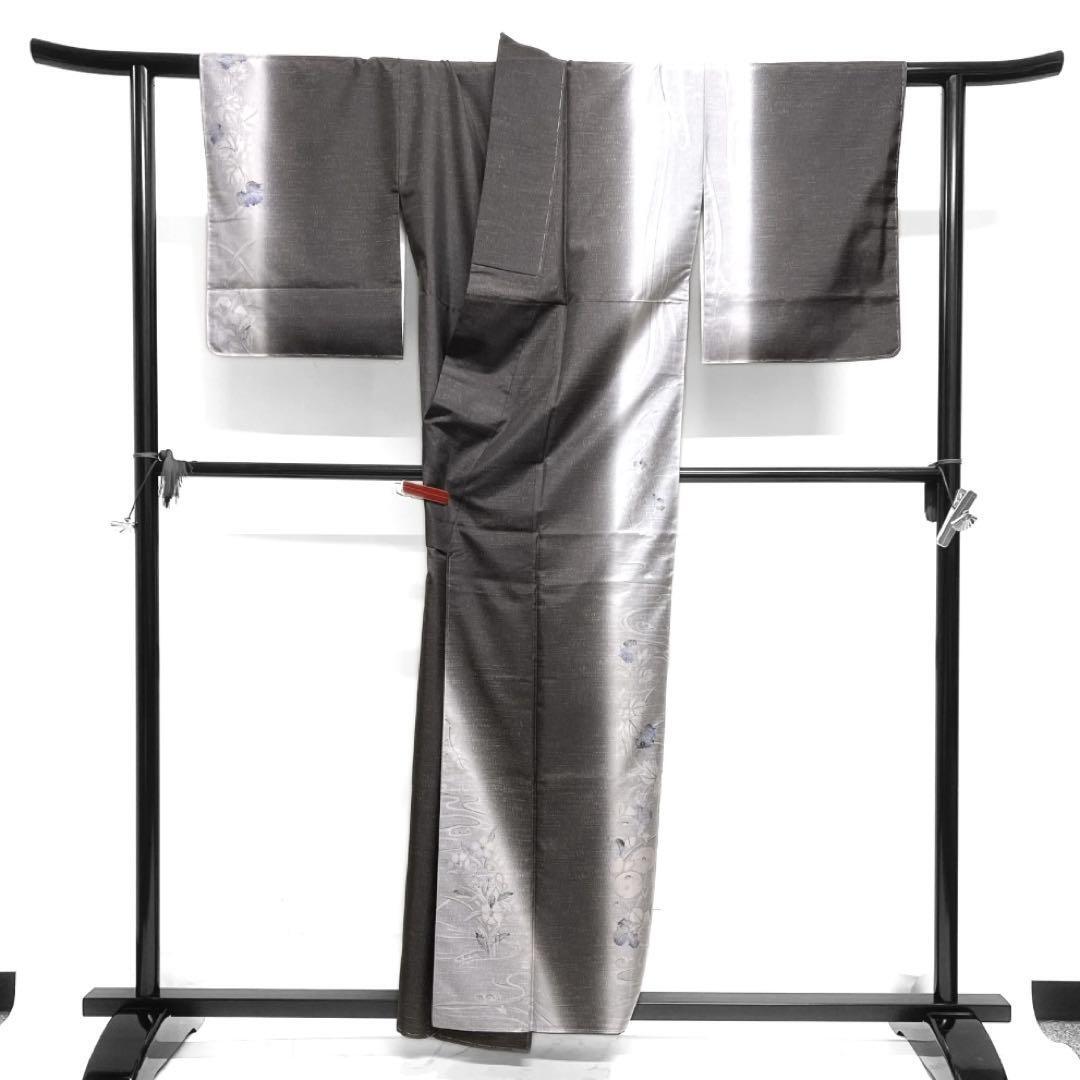 ブラウングレーと薄いグレーの染大島紬地に縦に流水と様々な花模様が描かれた華やかなデザインの一着です。