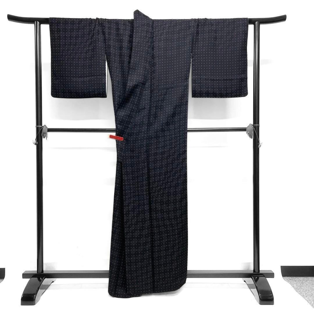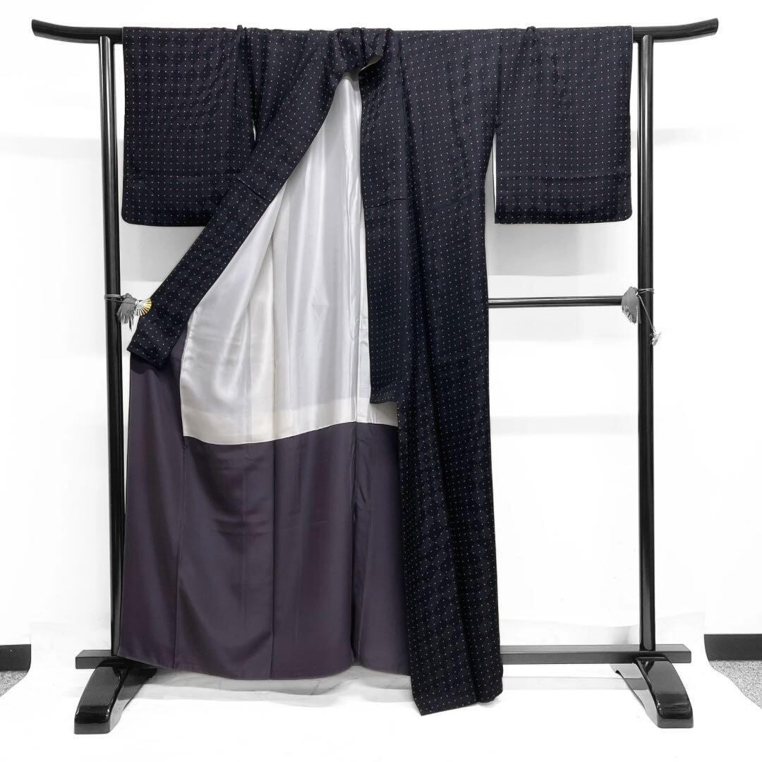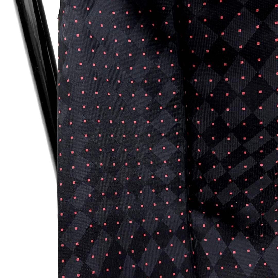 斜めの変わり市松地紋の黒地に薄い赤色の四角の幾何学文様が描かれたお洒落なデザインの一着です。