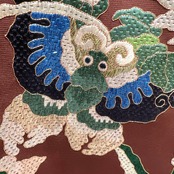 深いブラウンの地に絽刺しで織られた花瓶に菊や牡丹と蝶の文様が華やかなデザインの一着です。