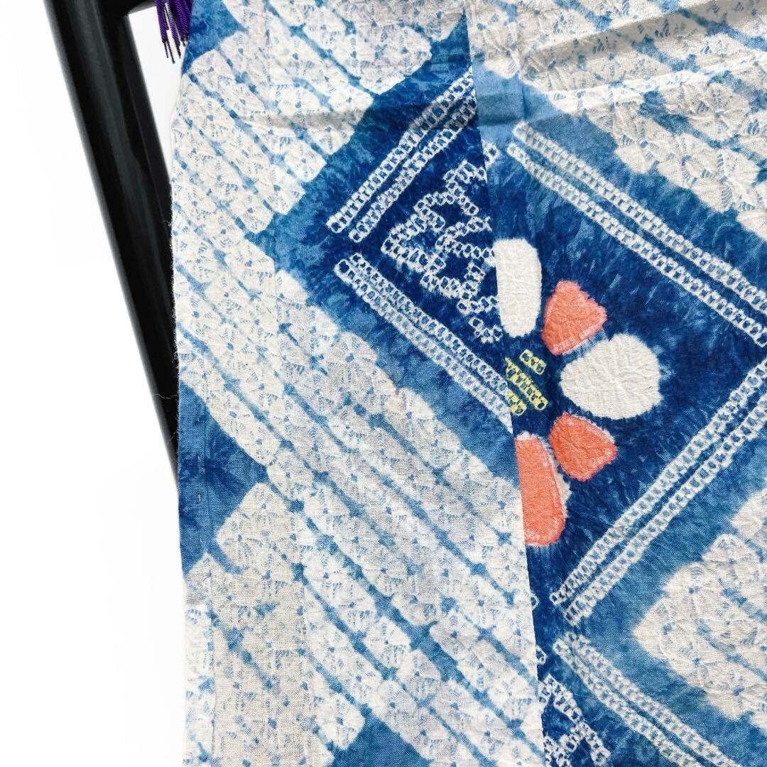 ライトブルーのグラデーションに有松鳴海絞りで描かれた菱に花模様がお洒落なデザインの一着です。