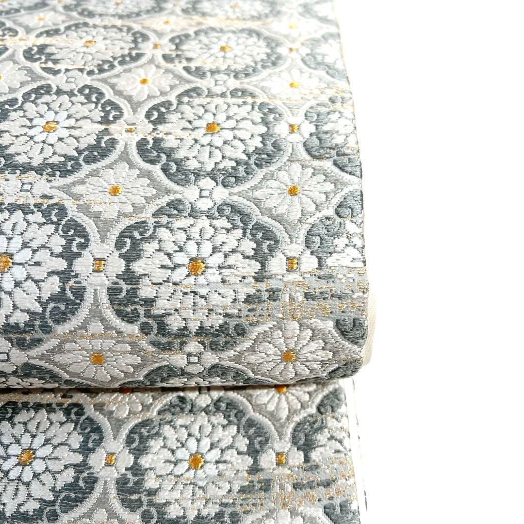 唐草と花模様のホワイトとグレーの市松文様と金糸を交えた華紋に霞が華やかなデザインの一着です。