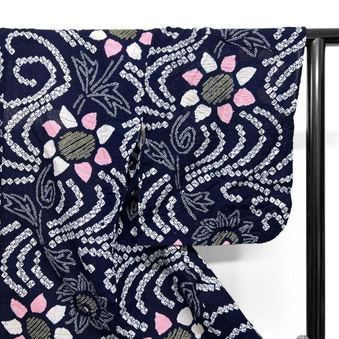 流線に花模様や鹿の子、渦模様が絞りでデザインされた浴衣です。