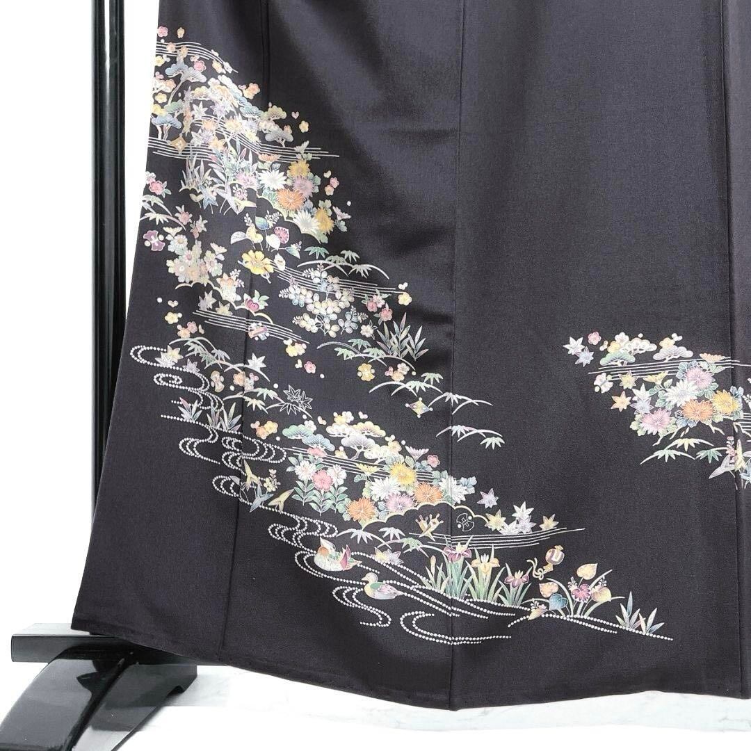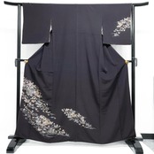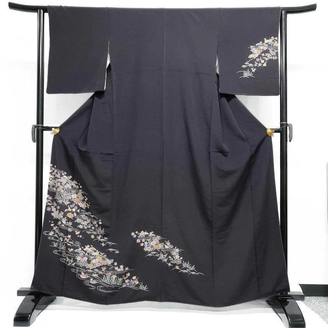 深いチャコールグレーに細やかな花模様が美しいデザインの一着です。