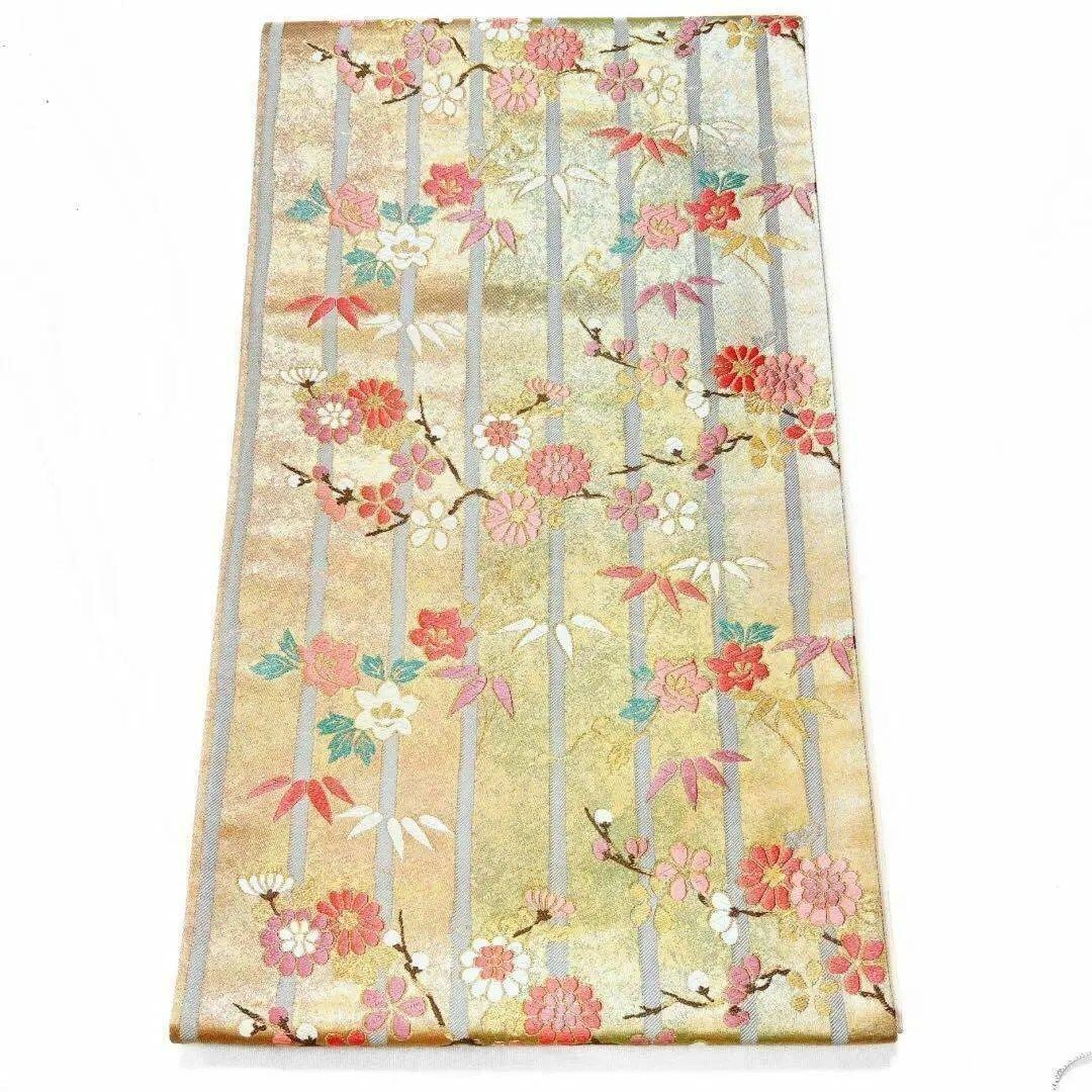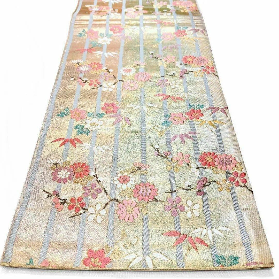 カラフルなグラデーション地に竹で縦縞がデザインされ、唐織で織られた華やかな花模様が美しい1着です。