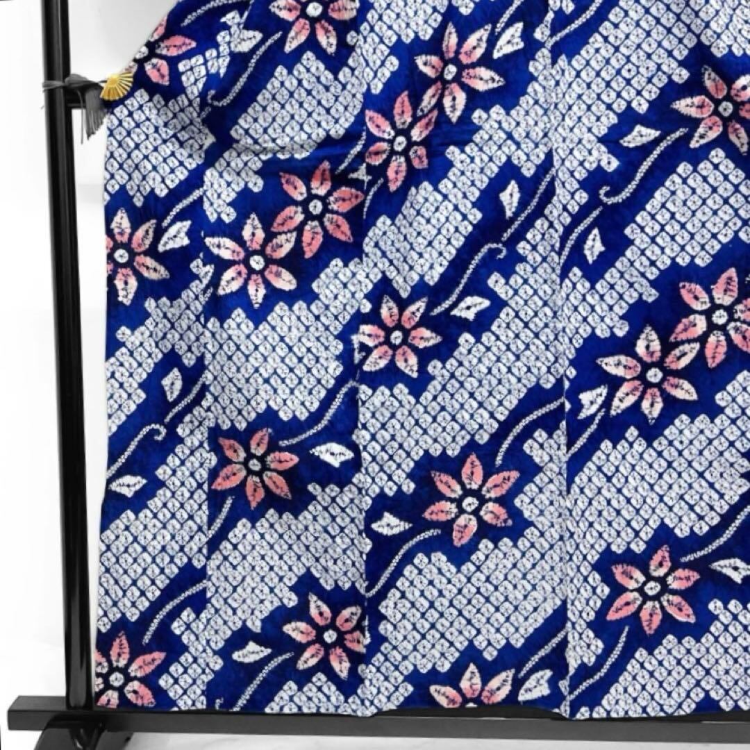 藍染のブルーのグラデーション地に有松鳴海絞りで描かれた蔦とリーフに花模様が描かれたお洒落なデザインの一着です。