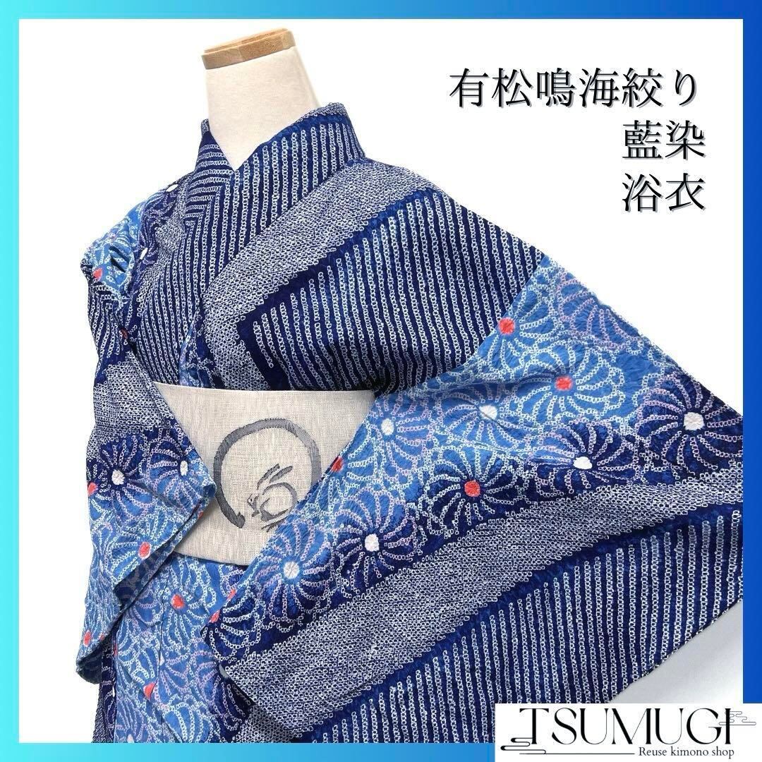 藍染のブルーのグラデーションの地に有松鳴海絞りで描かれた幾何学と縞模様に菊花の文様がお洒落なデザインの一着です。