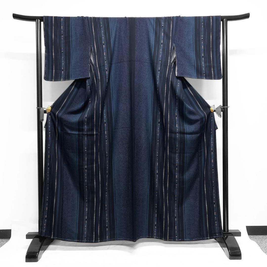 くすみのブルーと黒の地に横縞とたたき染、四角の幾何学模様による縦縞が描かれたお洒落なデザインの一着です。