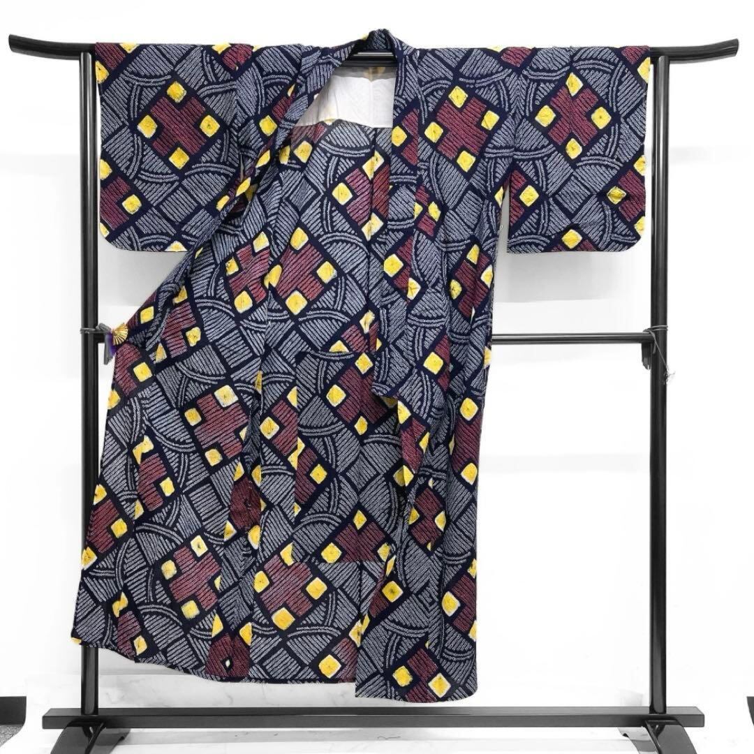 藍染のネイビーの地に有松鳴海絞りで描かれた変わり格子にイエローを交えた菱の文様が目を惹くお洒落なデザインの一着です。