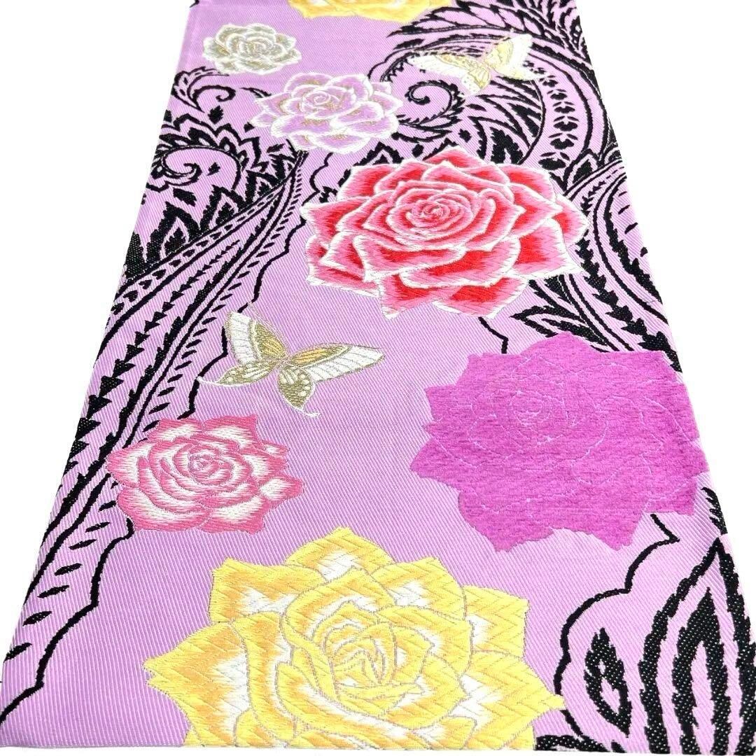 アラベスクに薔薇や蝶が金糸を交え華やかに織り出された振袖帯としてもお使いいただける1着です。