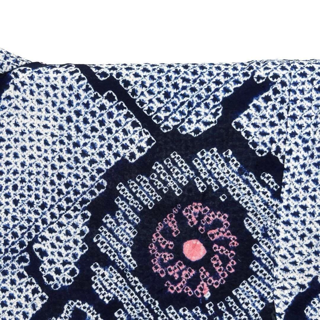 ネイビーの地に有松鳴海絞りで描かれた菊花とピンクの花模様がお洒落なデザインの一着です。