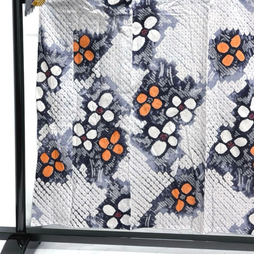 グレーのグラデーション地に有松鳴海絞りで描かれた鹿の子と花模様がお洒落なデザインの一着です。